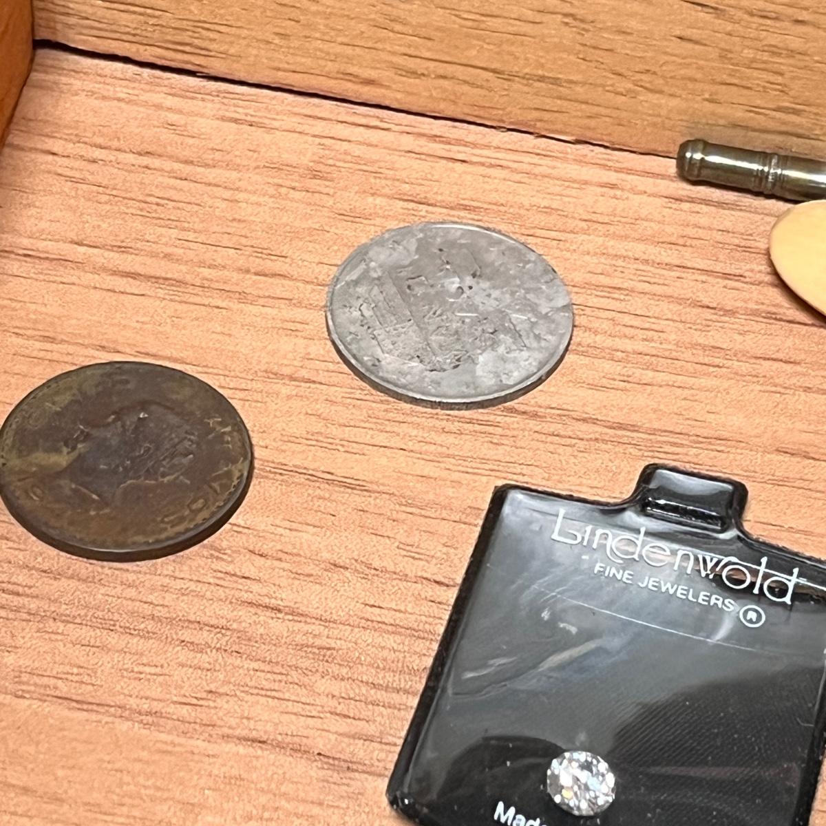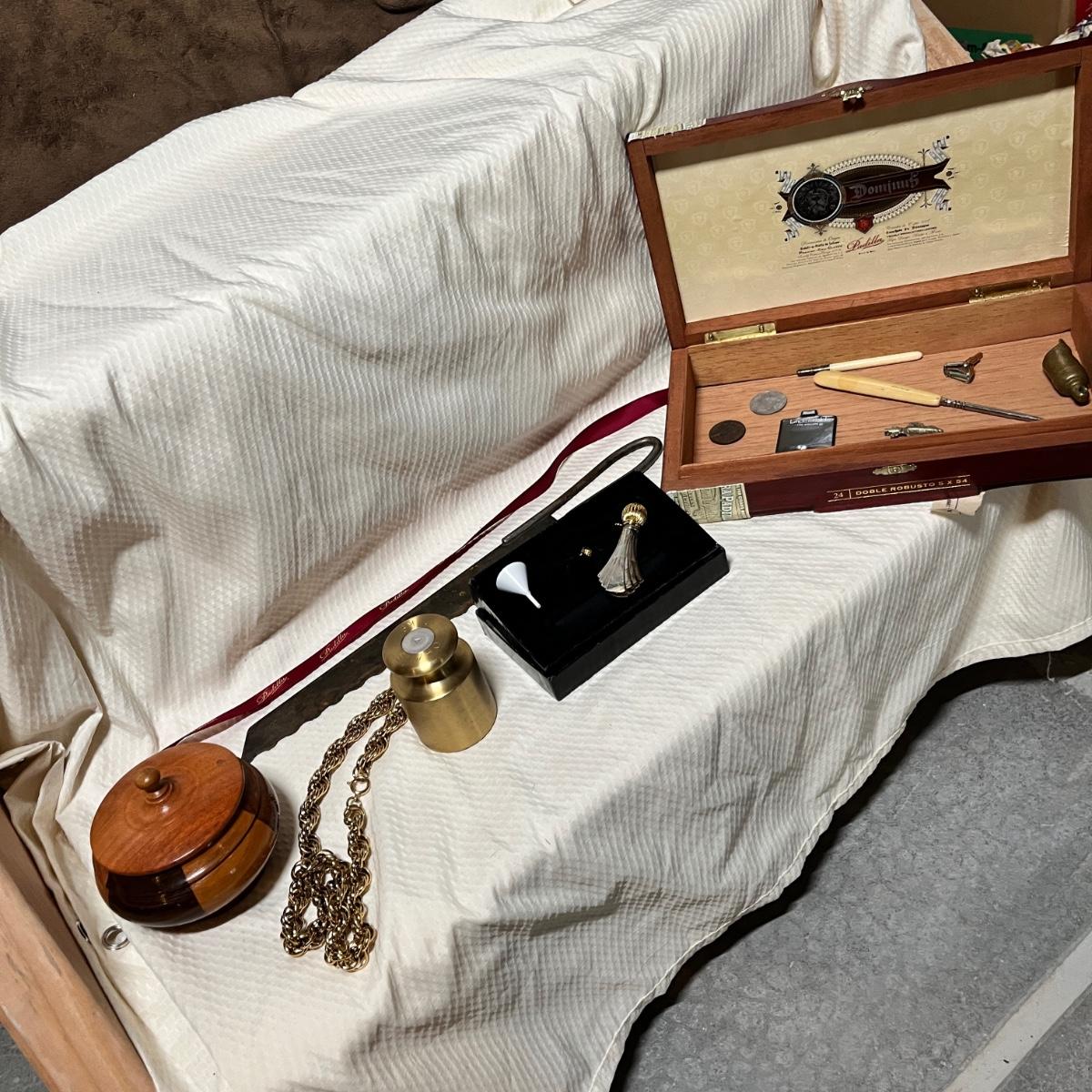 Wooden boxes, perfume bottle, brass weight, antique bread knife, button hook, brass whistle