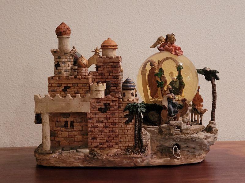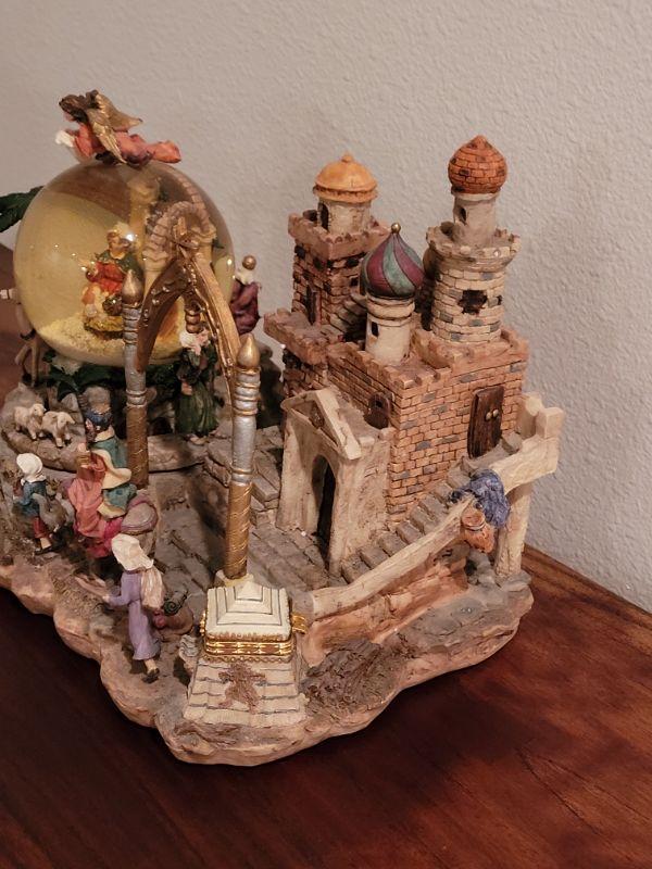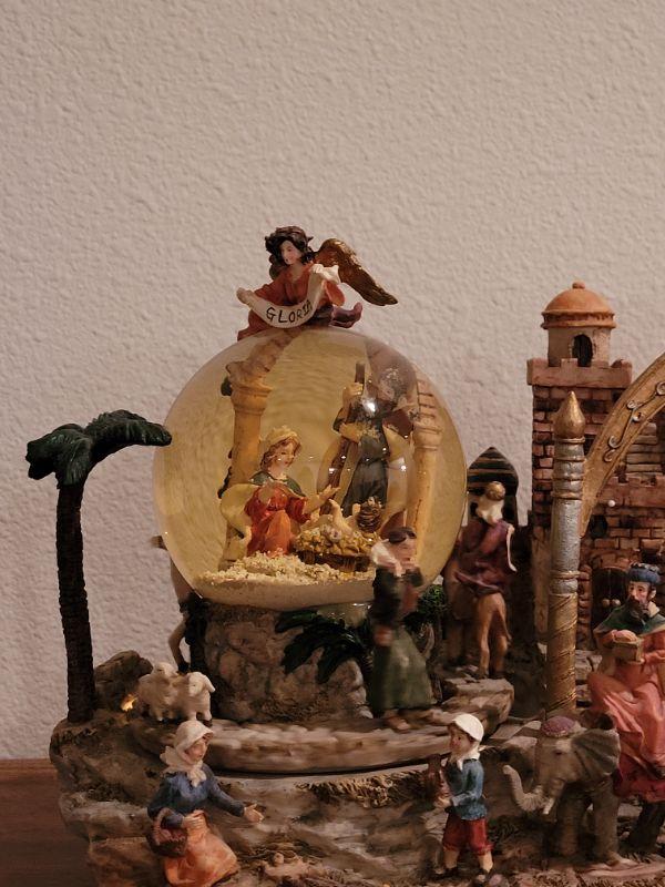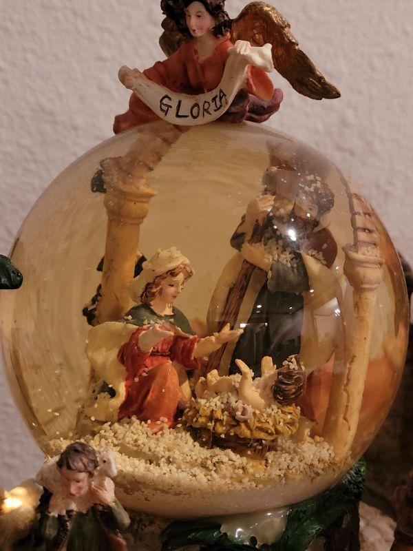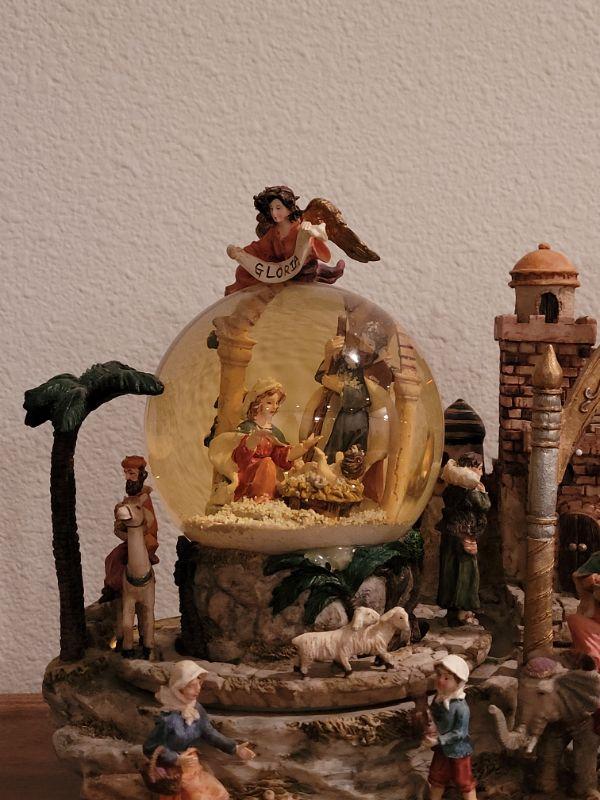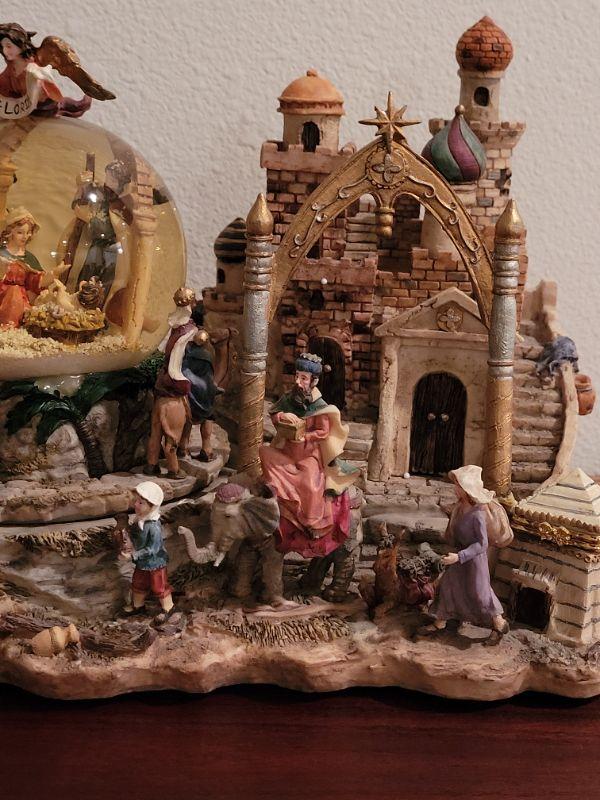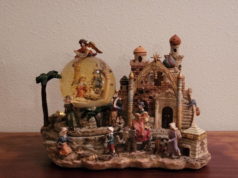 Lot 121: Vintage Musical Nativity Snow Globe with Circling Well Wishers