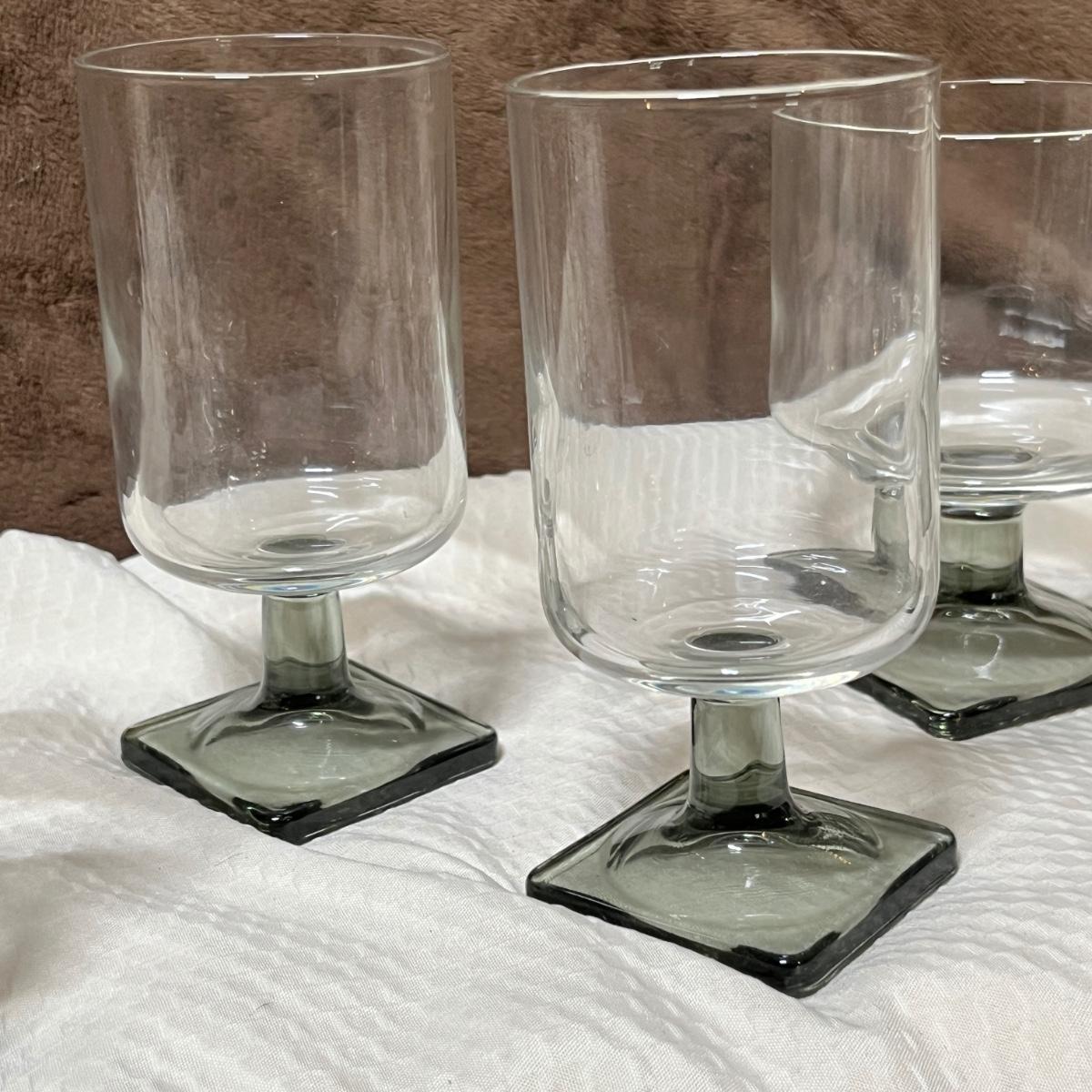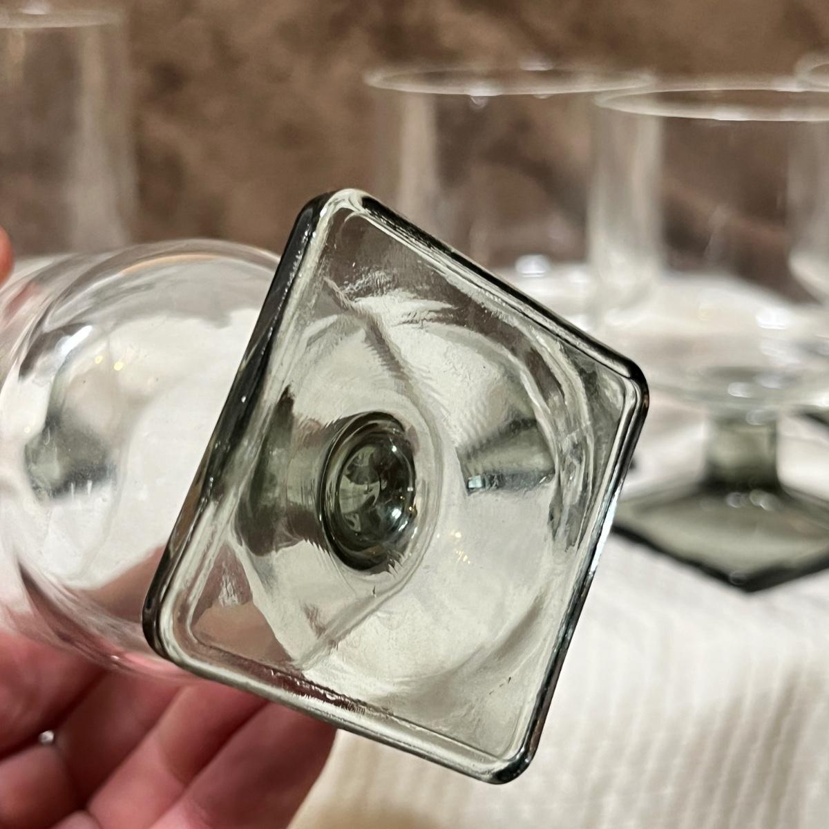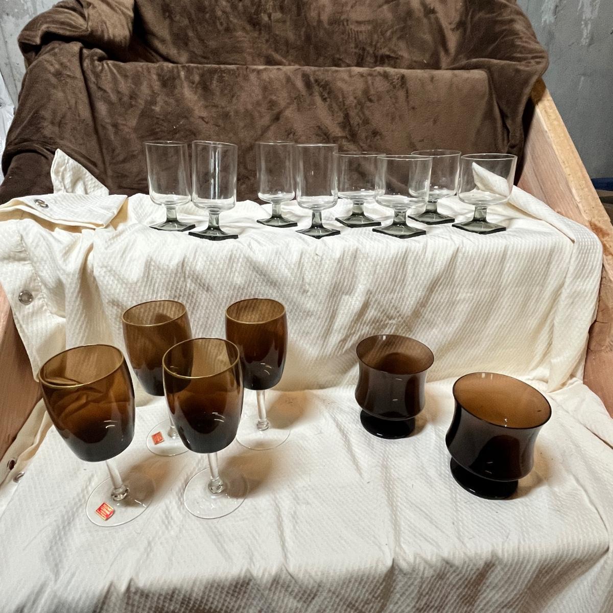 4 Brown gold-rimmed stemmed glasses, 2 dessert bowls, 8 clear glass square bottom glassware