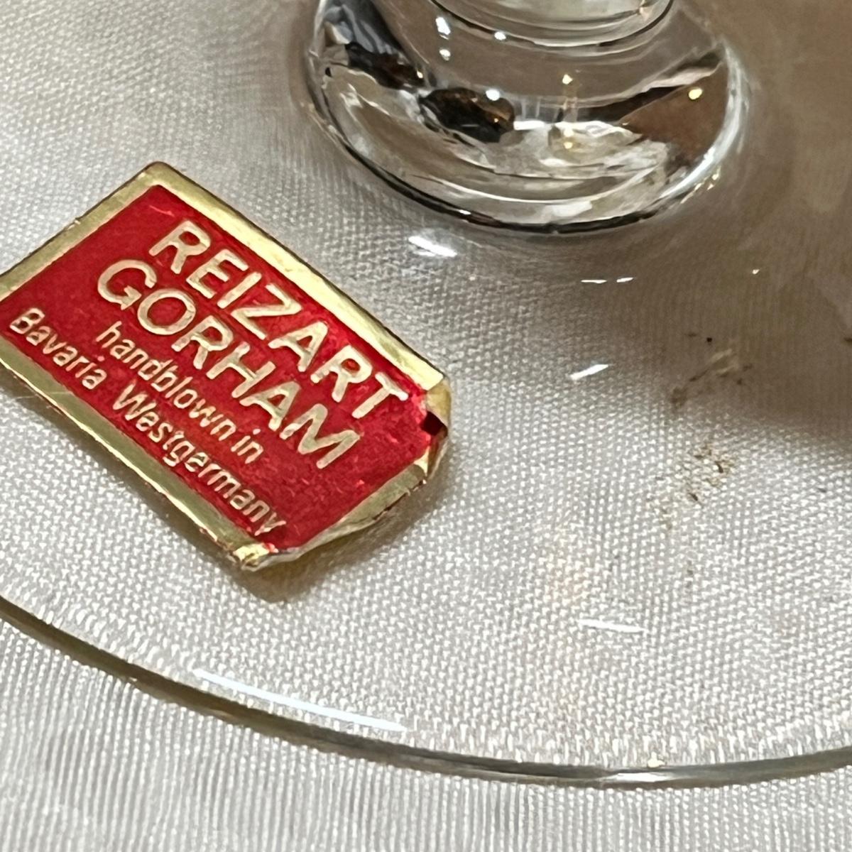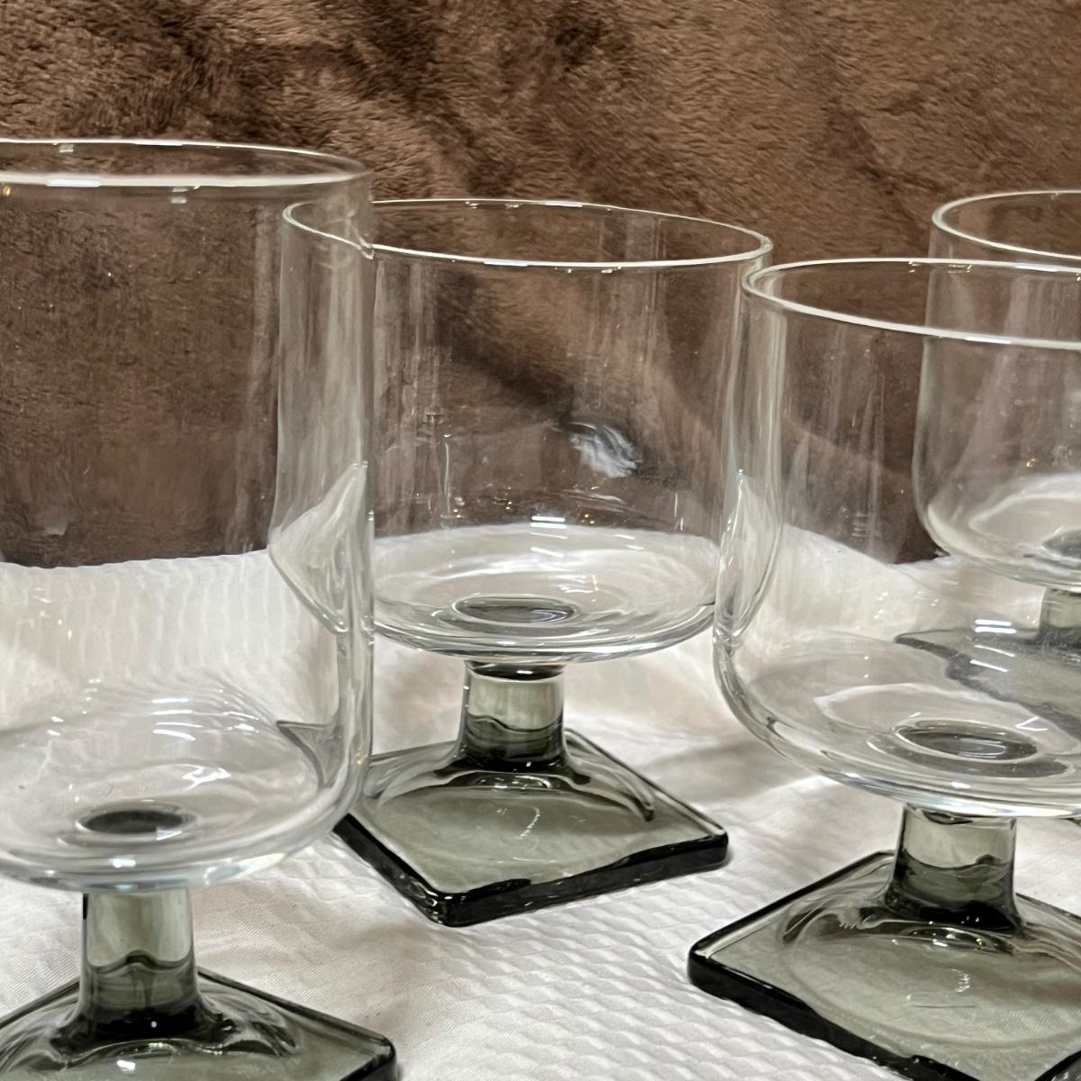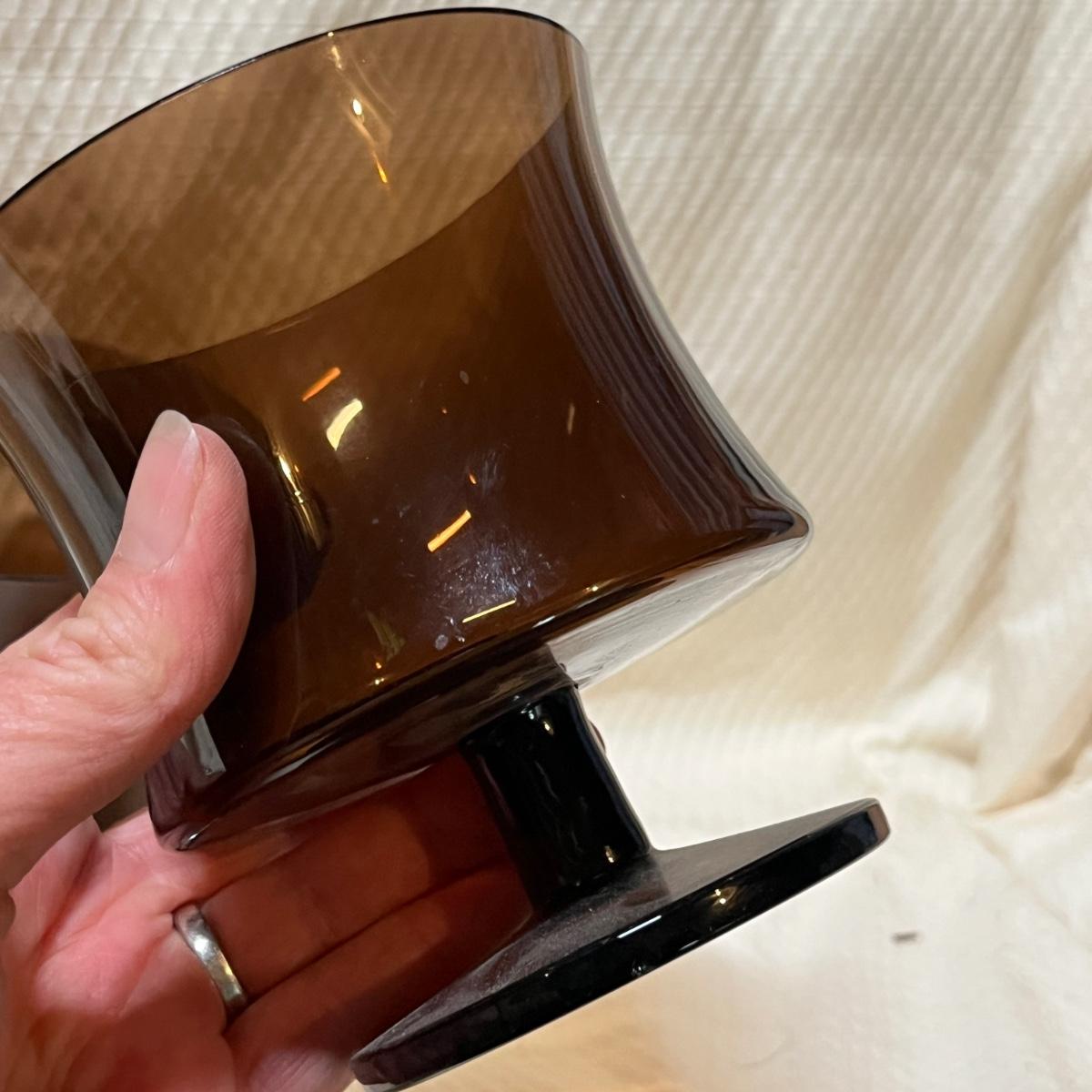 4 Brown gold-rimmed stemmed glasses, 2 dessert bowls, 8 clear glass square bottom glassware