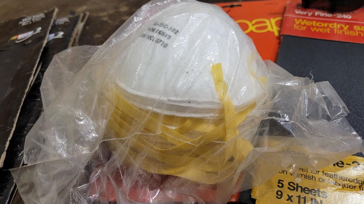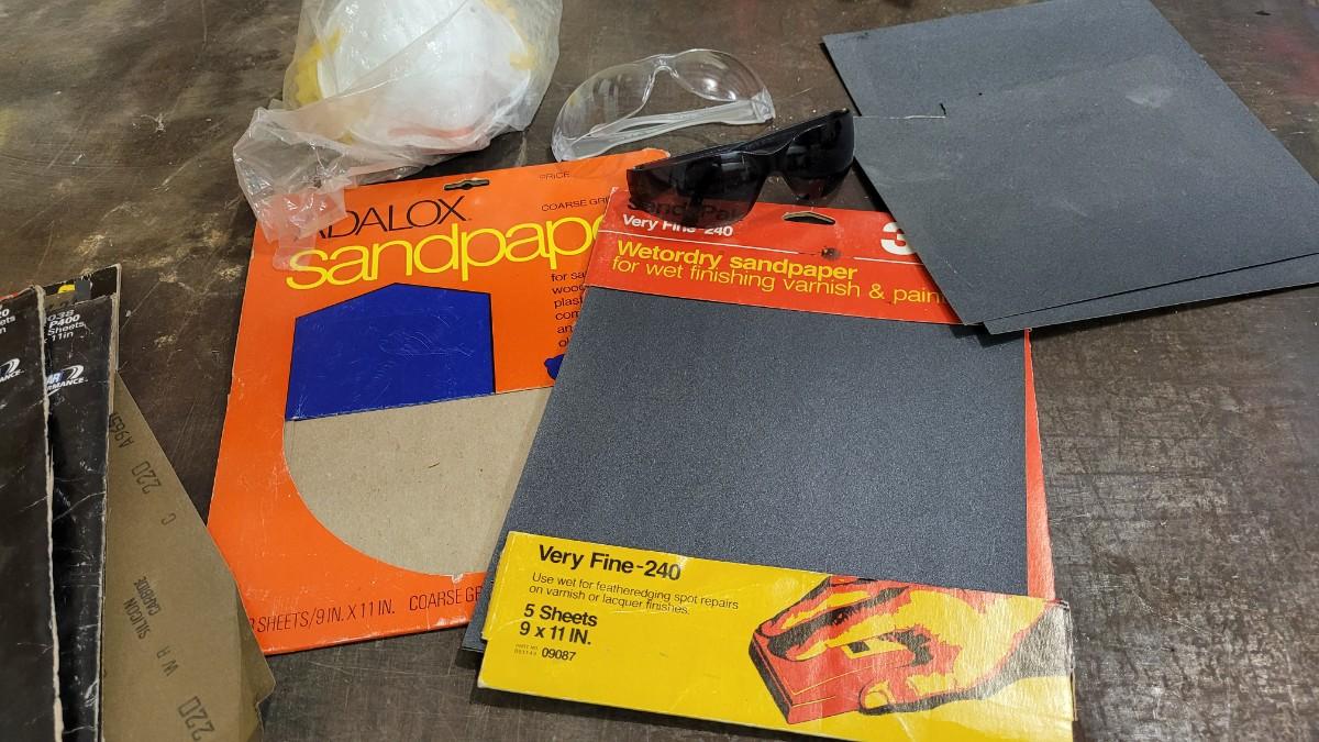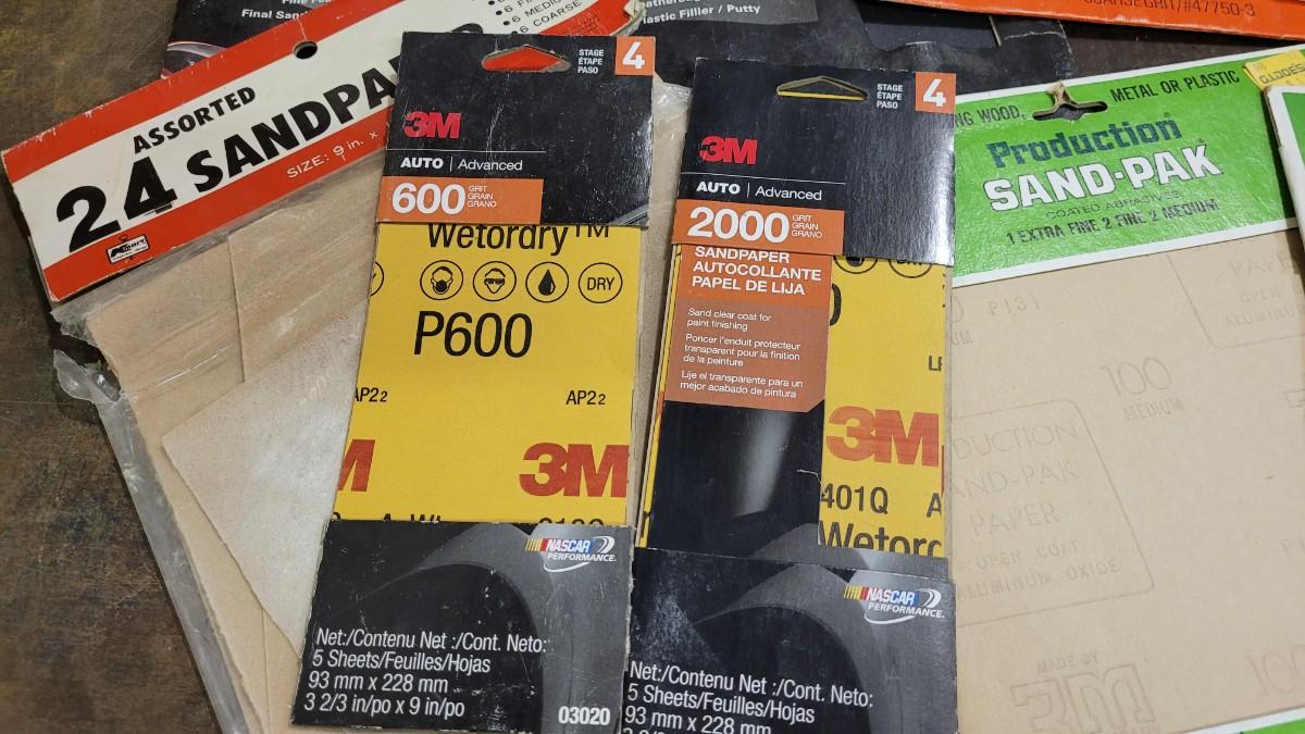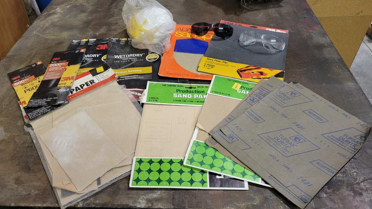 Lot 128: Assorted Sandpaper Packs + (2) Safety Glasses and Pack of Dust Masks