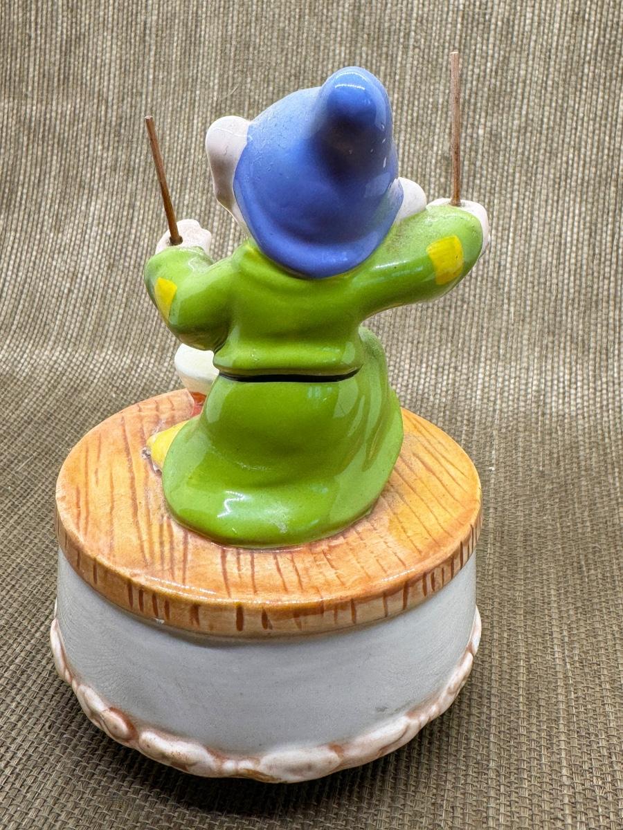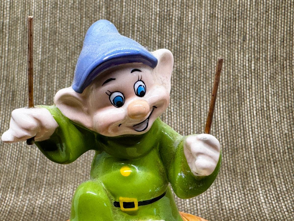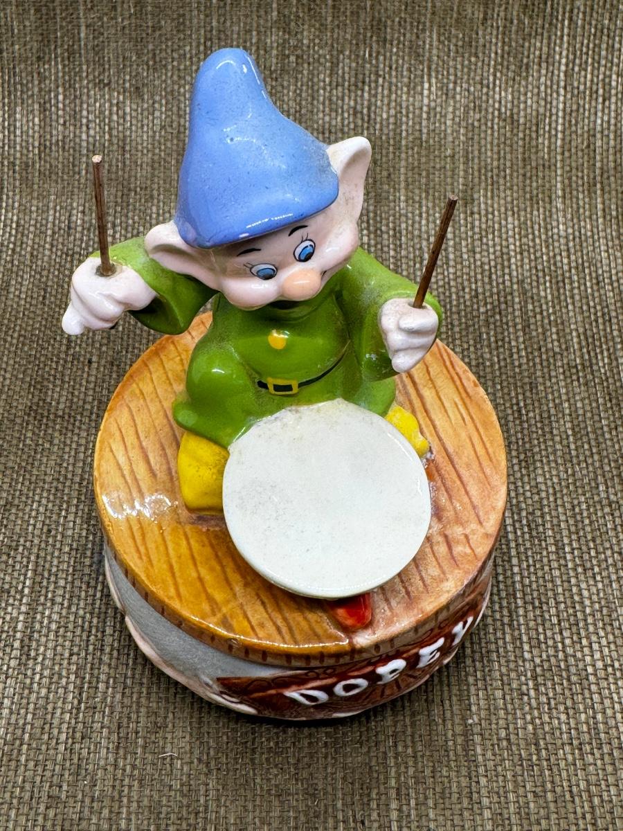 LOT 13 - Vintage Disney Dopey Snow White Music Box that works. To wind the box you twist the base and then it spins and plays music. A video of it will be up on our Instagram page Green and Cate. It measures 5 inches tall and is 3 1/2 inches in diameter. No obvious chips or cracks.