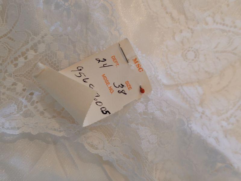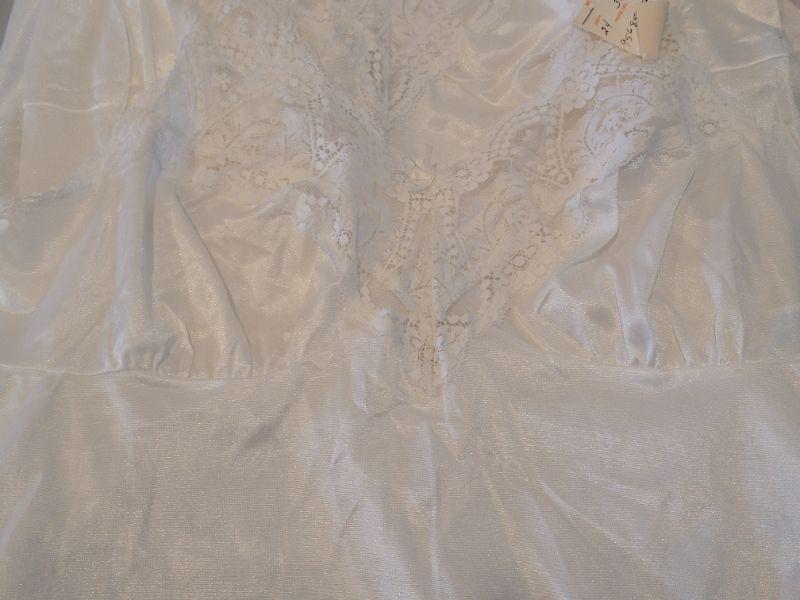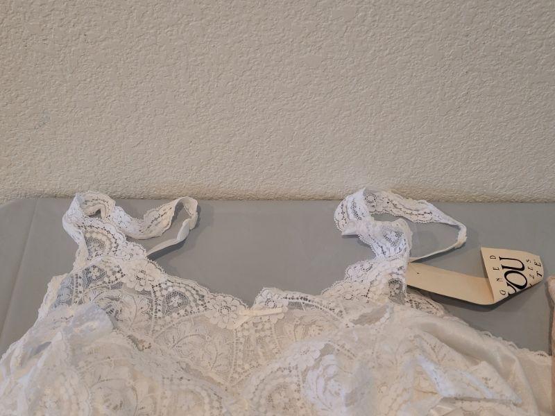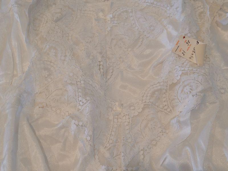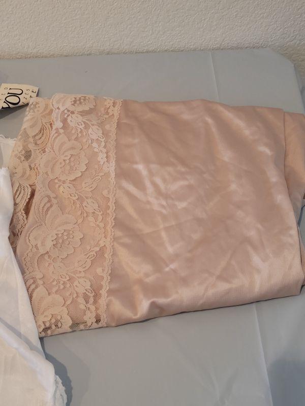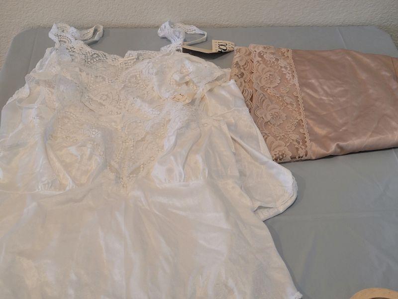 Lot 133: (4) New White Lace Trimed Camisoles and one Tan Long Lace Trimed Split Skirt Slip