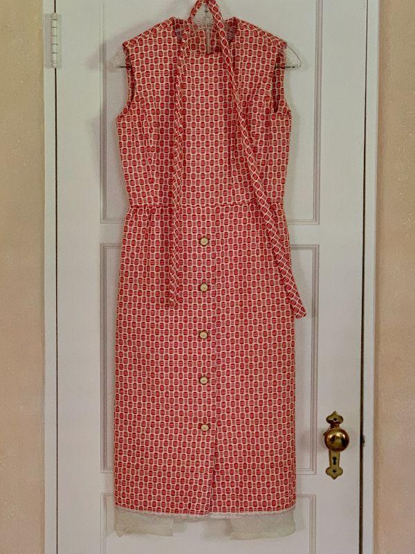 That thick polyester, won't wrinkle even if it tried! Red/white textured print sleeveless dress with matching long sleeve short jacket and tie belt Size 12/14 Hem is unfinished