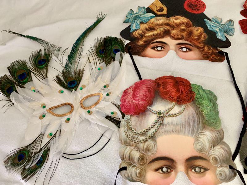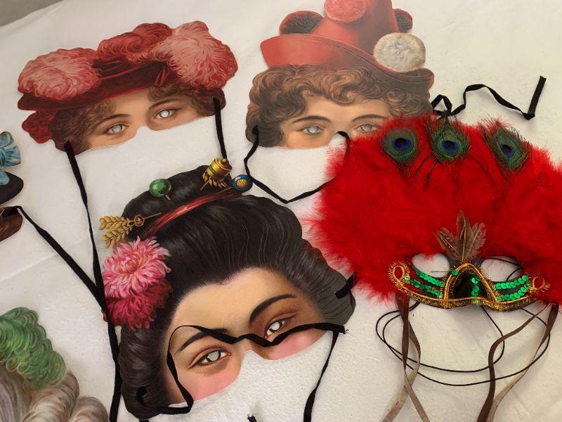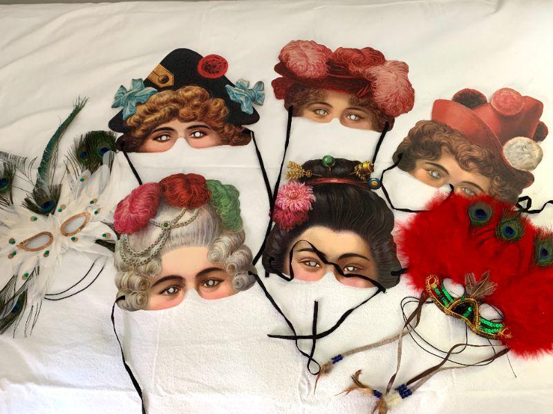 5 paper masks from the Victoria & Albert Museum & 2 feathered Mardi Gras masks