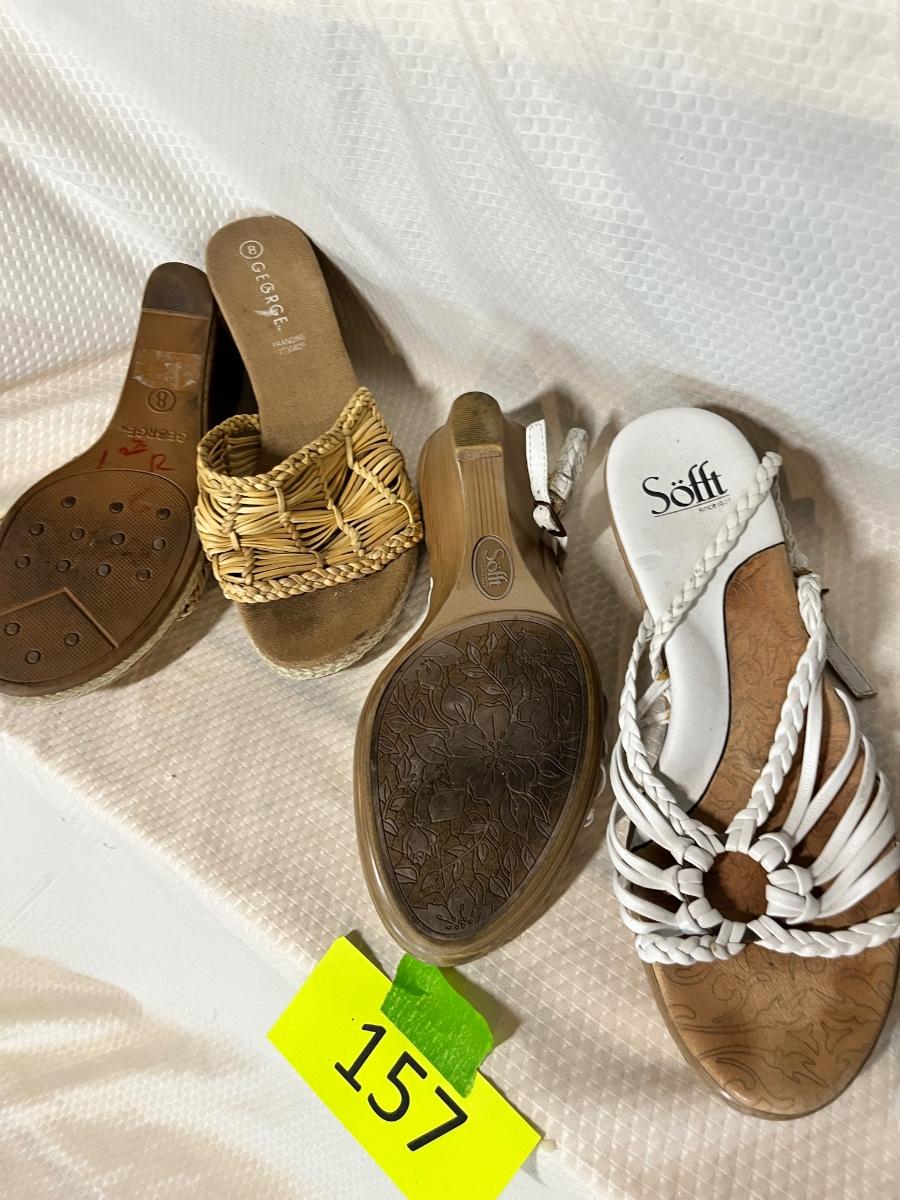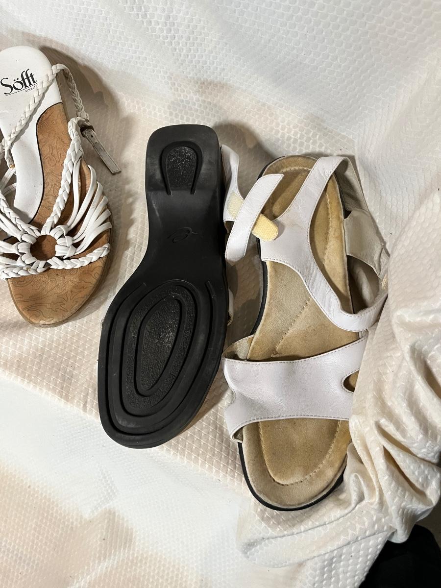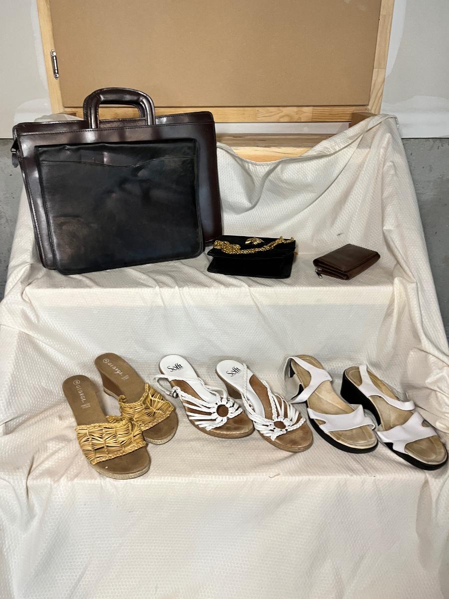 3 pair casual sandals, black evening bag, small wallet and 2 portfolio/binders