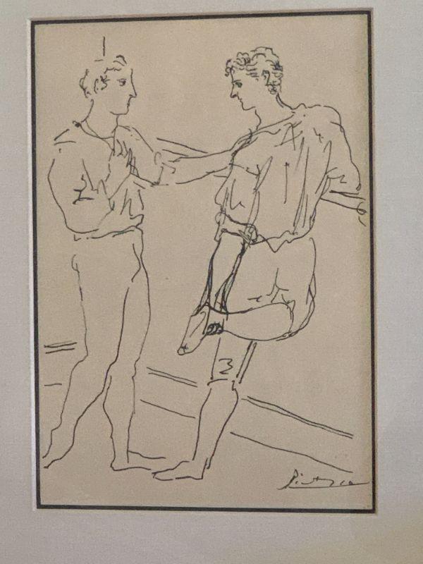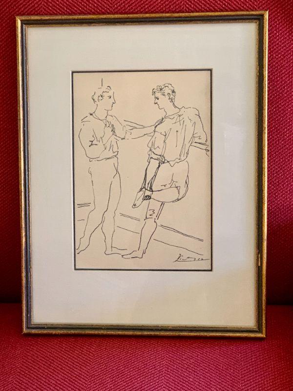 LOT 158 VINTAGE FRAMED PICASSO PRINT DRAWING OF 2 MEN