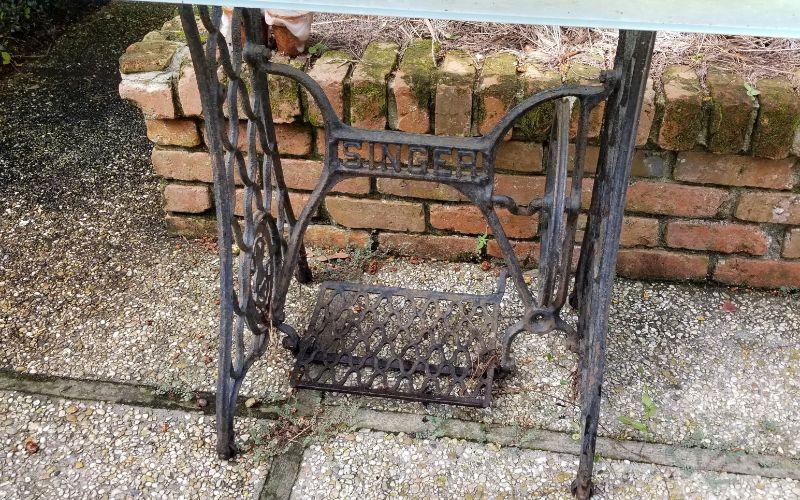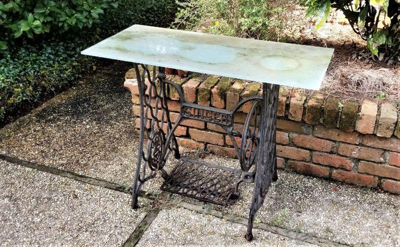 Antique cast iron Singer sewing machine base with a frosted (lift-off) glass top. Perfect for the garden or patio. 28.5" tall, 36" across, 16" deep. See photos for condition.