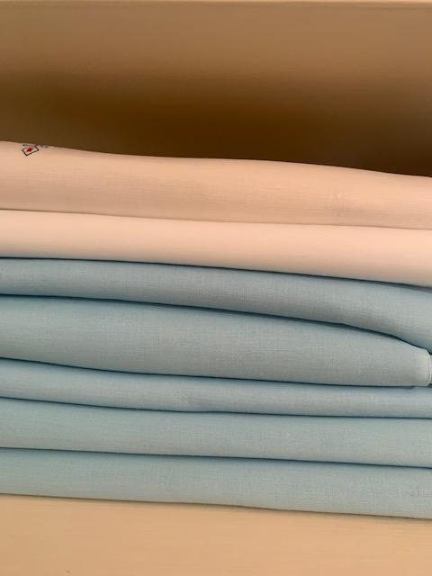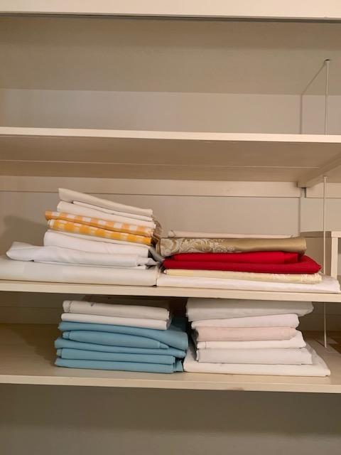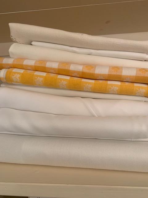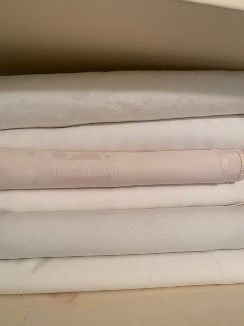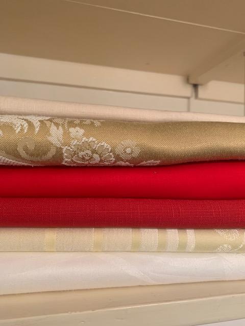 Lot of 27 fabric table cloths. Assorted sizes and colors.