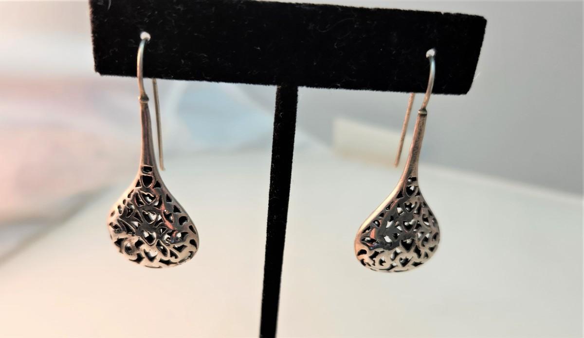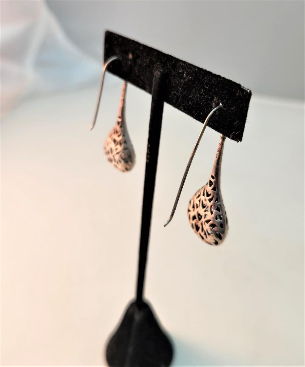 Sterling Silver earrings, pierced teardrop design, long "drop" (1.5" long) - nice long hooks. Gently used condition. Weighs. about 5.5 grams.