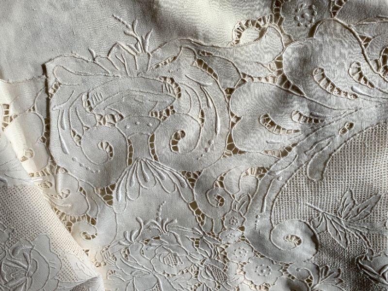 Extra large heavily embroidered rose motif antique tablecloth 110" x 130"