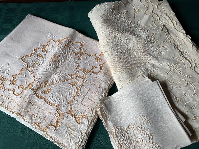 Fancy cutwork heavily embroidered antique table cloth w/napkins 83" x 80"