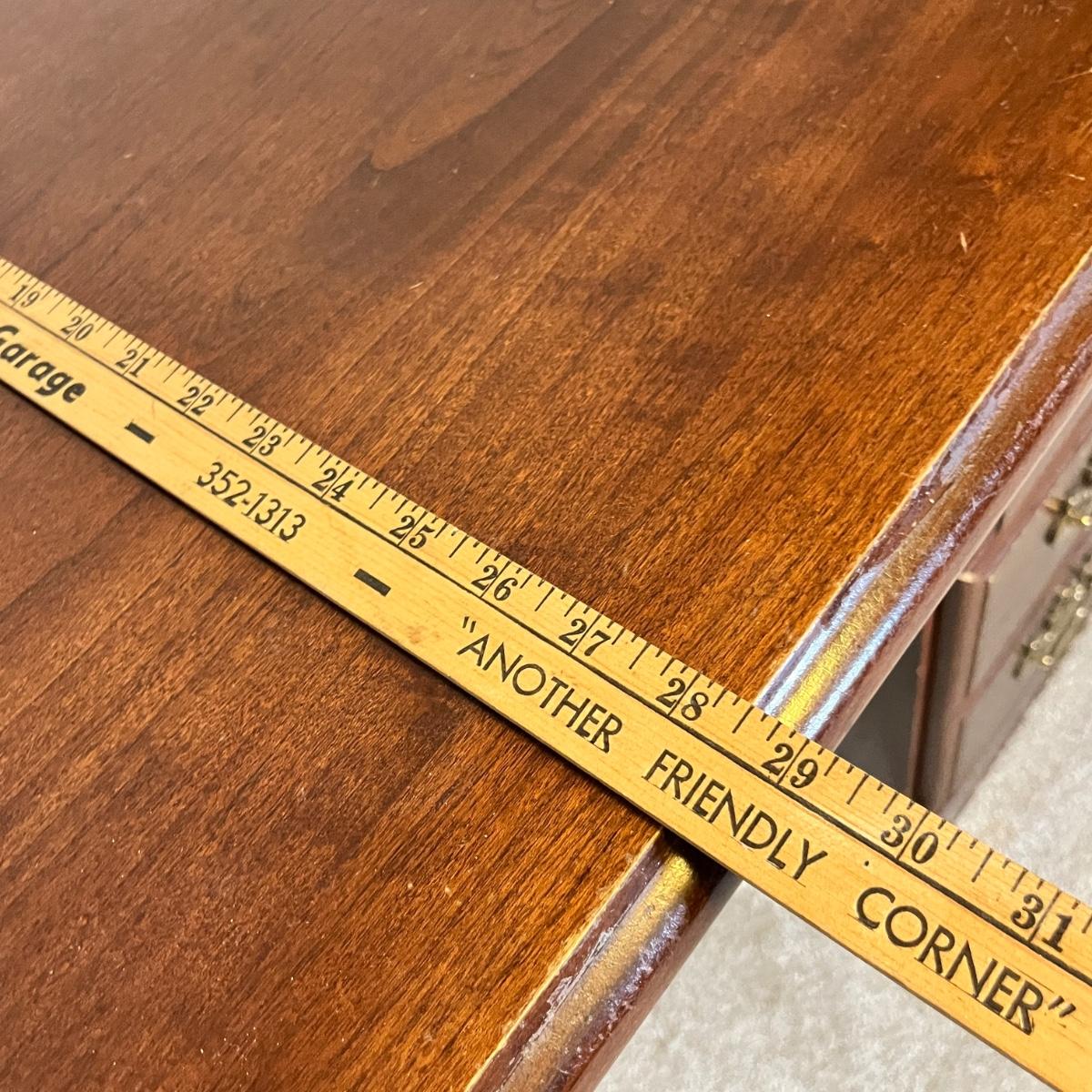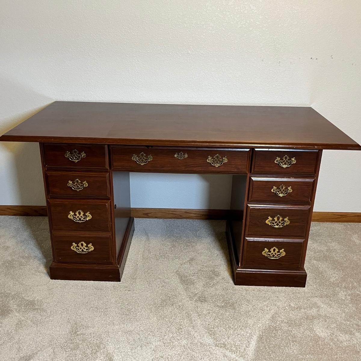 Mahogany finish. Great smaller sized desk. It is in the basement!