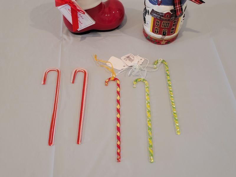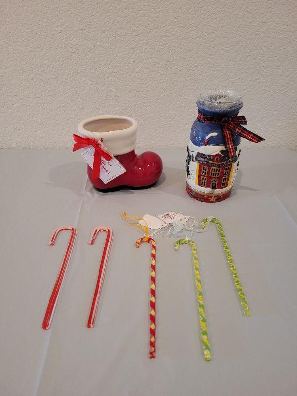 Lot 217: New Santa Giving Boot, Jar Candle Holder and Glass Candy Canes