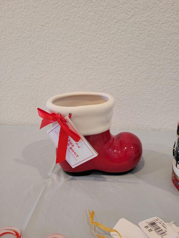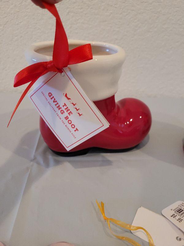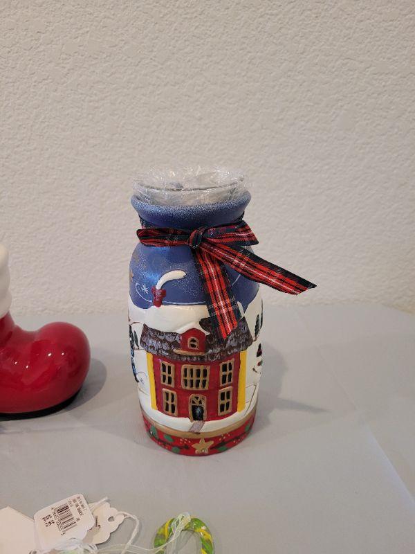 Lot 217: New  Santa Giving Boot, Jar Candle Holder and Glass Candy Canes