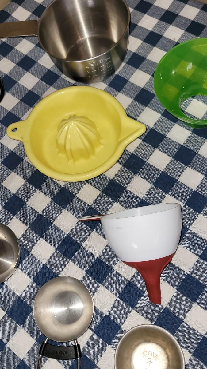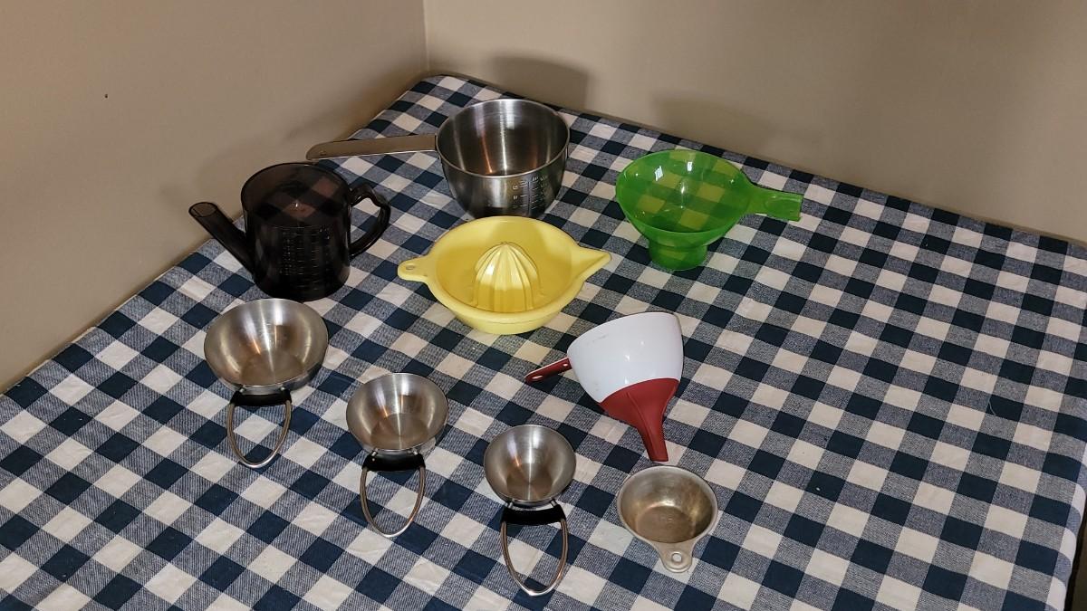 Lot 225: Kitchen Assorted Measuring Cups, Juicer & Funnels