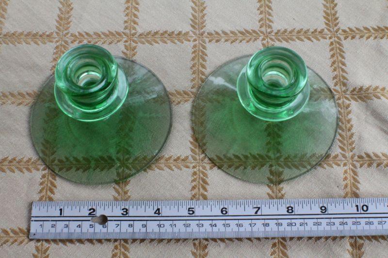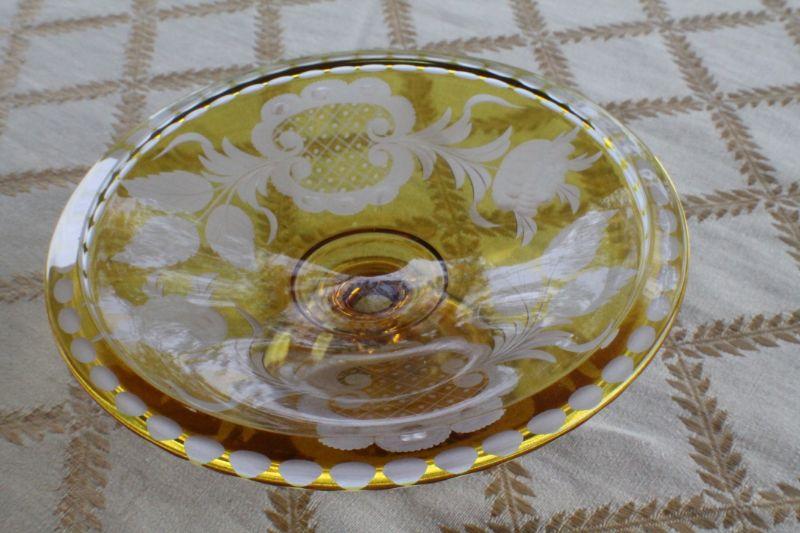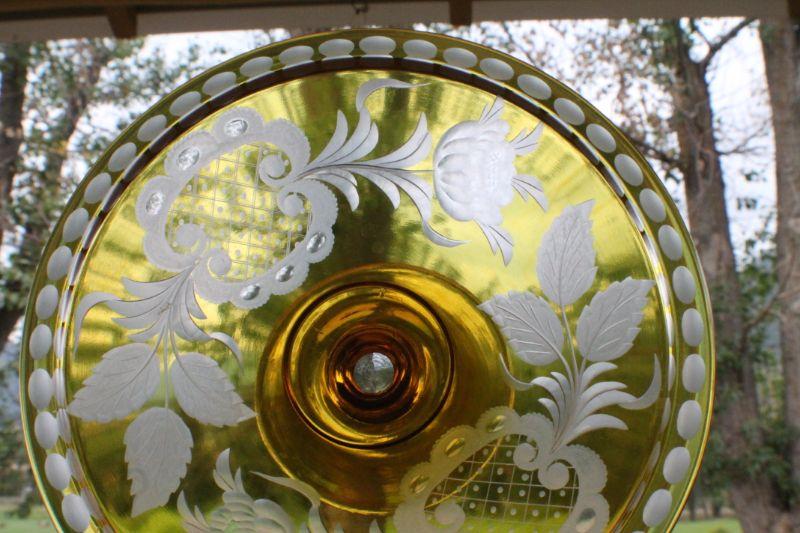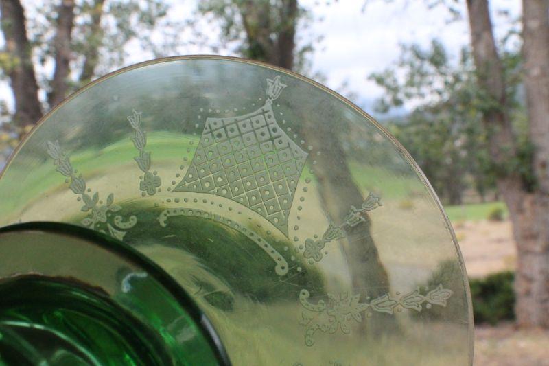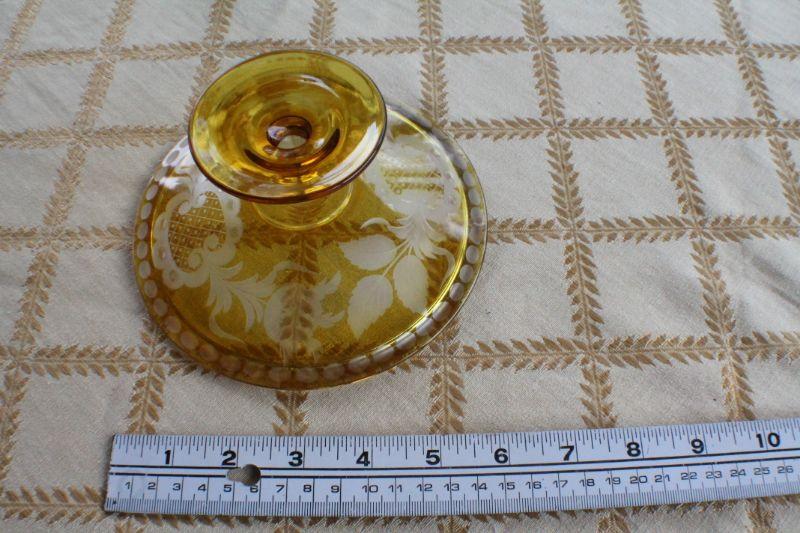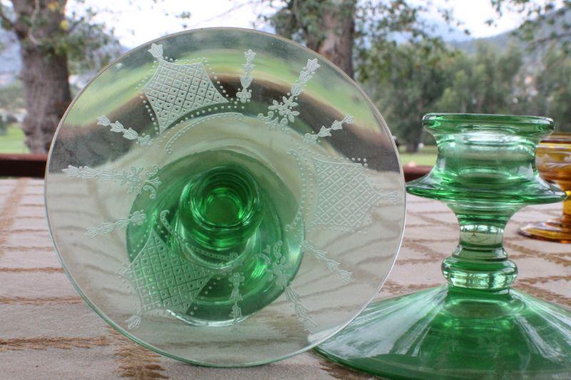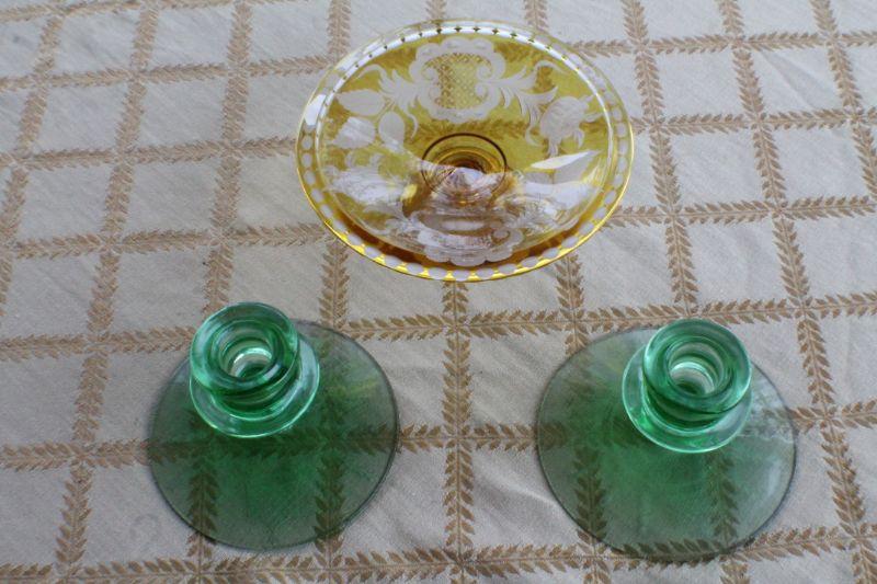 Lot #234: (3) Vintage Assorted Fancy Etching Glass Creations (2 Green Candle Holders and One Amber Small Dish)