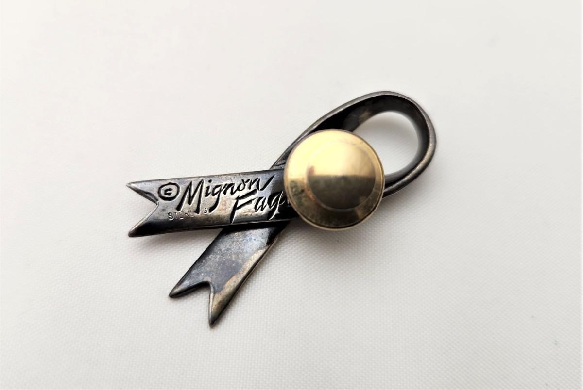 Signed Sterling Mignon Faget ribbon brooch - note: the gold back may not be original to the pin (not sure), but it works. Measures about 1.5" long. Weighs 5 grams without the back. Good condition.