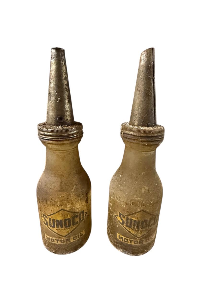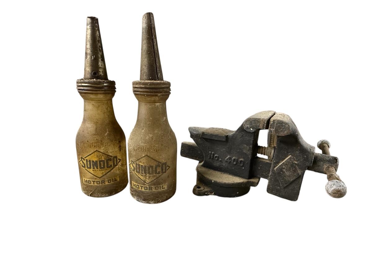 Lot 25: Vintage Sunoco Motor Oil Bottles And Vice