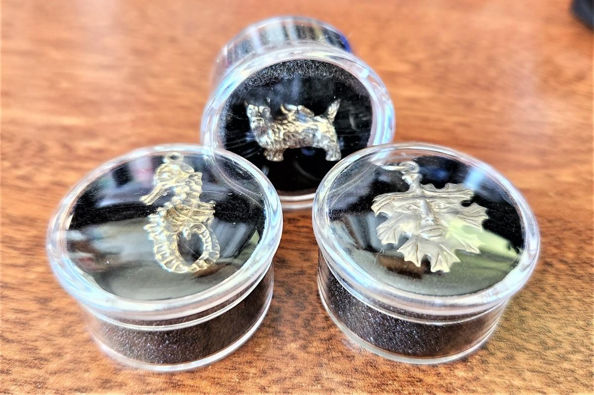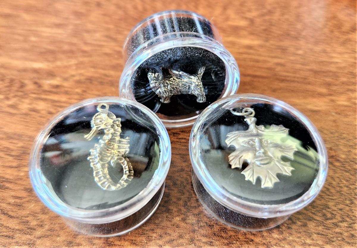 Lot of three cute vintage sterling silver charms - seahorse. schnauzer, and "Green Man". All come in the cases shown. Note: the seahorse does not have a bail. Seahorse and Green Man are each 1" long, dog about 3/4" inch.