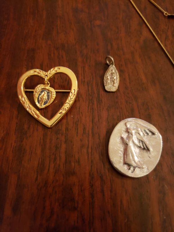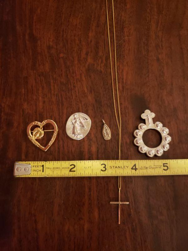 Lot 303: Vintage Gold Fill Cross Necklace, Virginia Mary Brooch and Pendant Lot