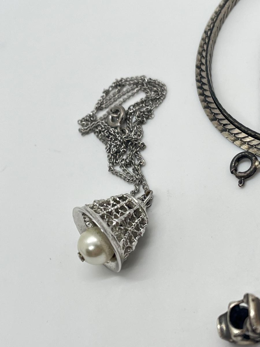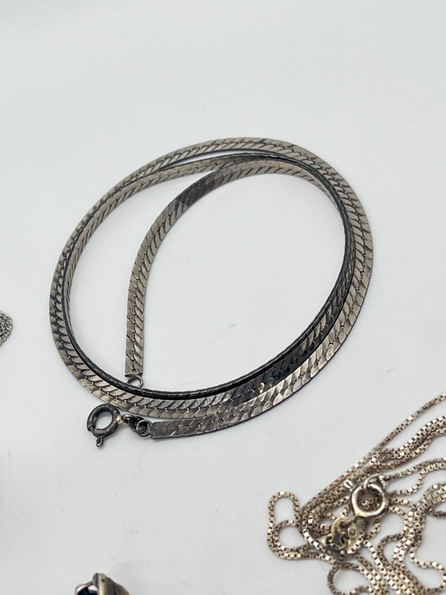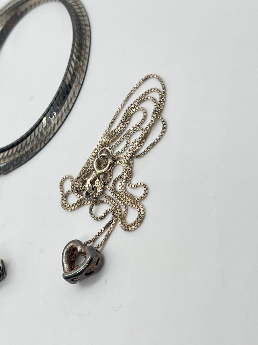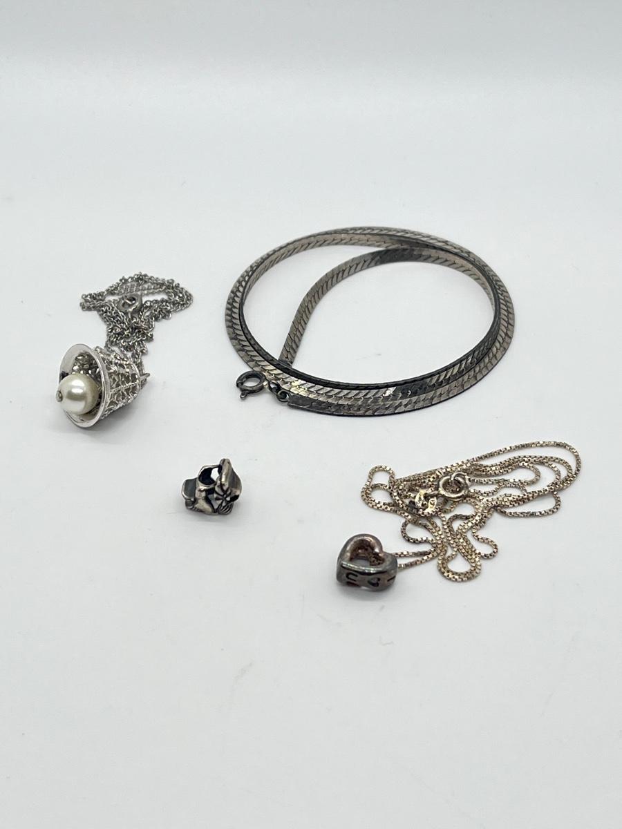 LOT 326J: Sterling Silver Jewelry Lot - 17" Necklace with Bell, 20" Herringbone, 24" w/ Heart and Charm
