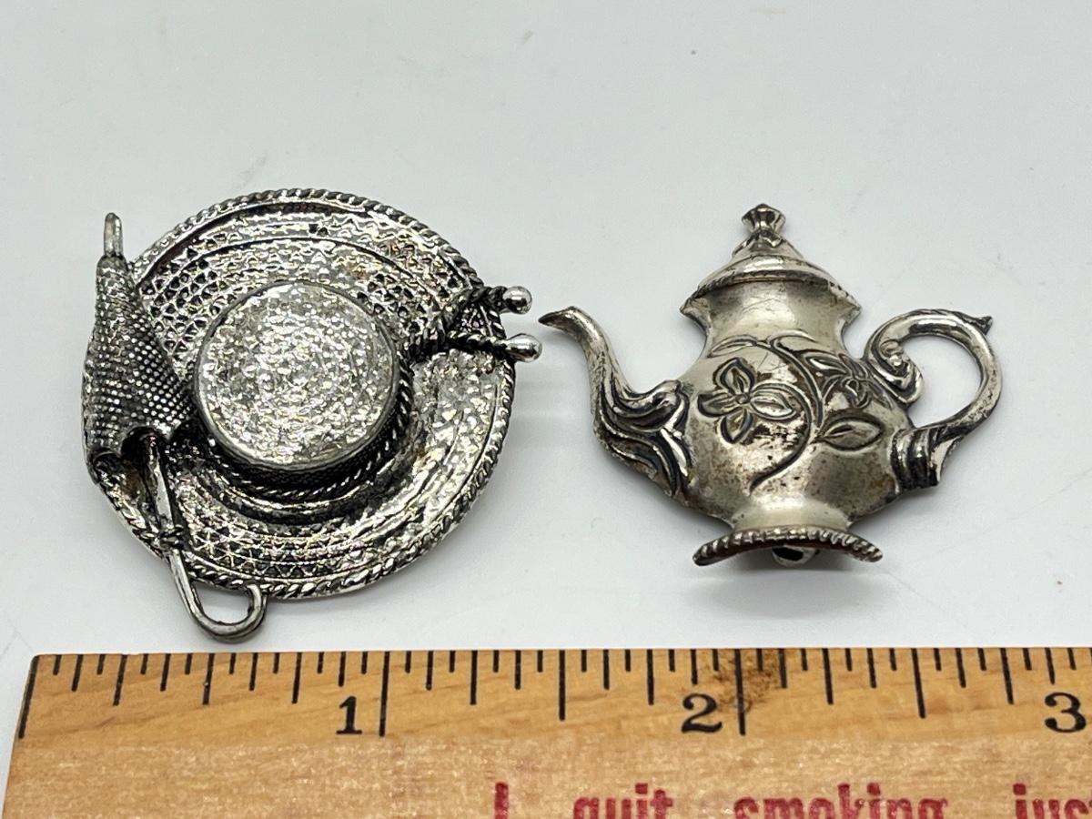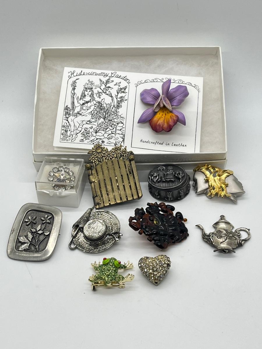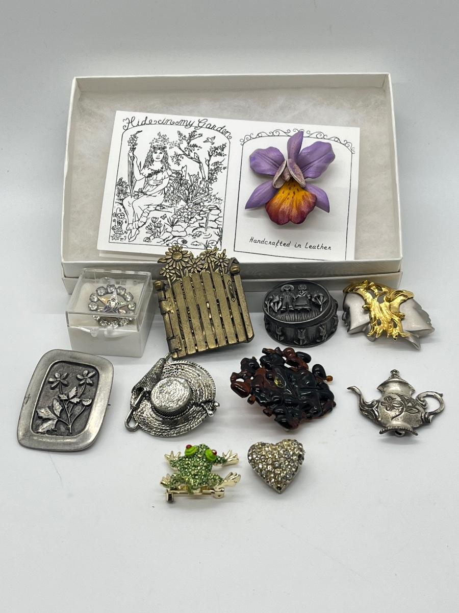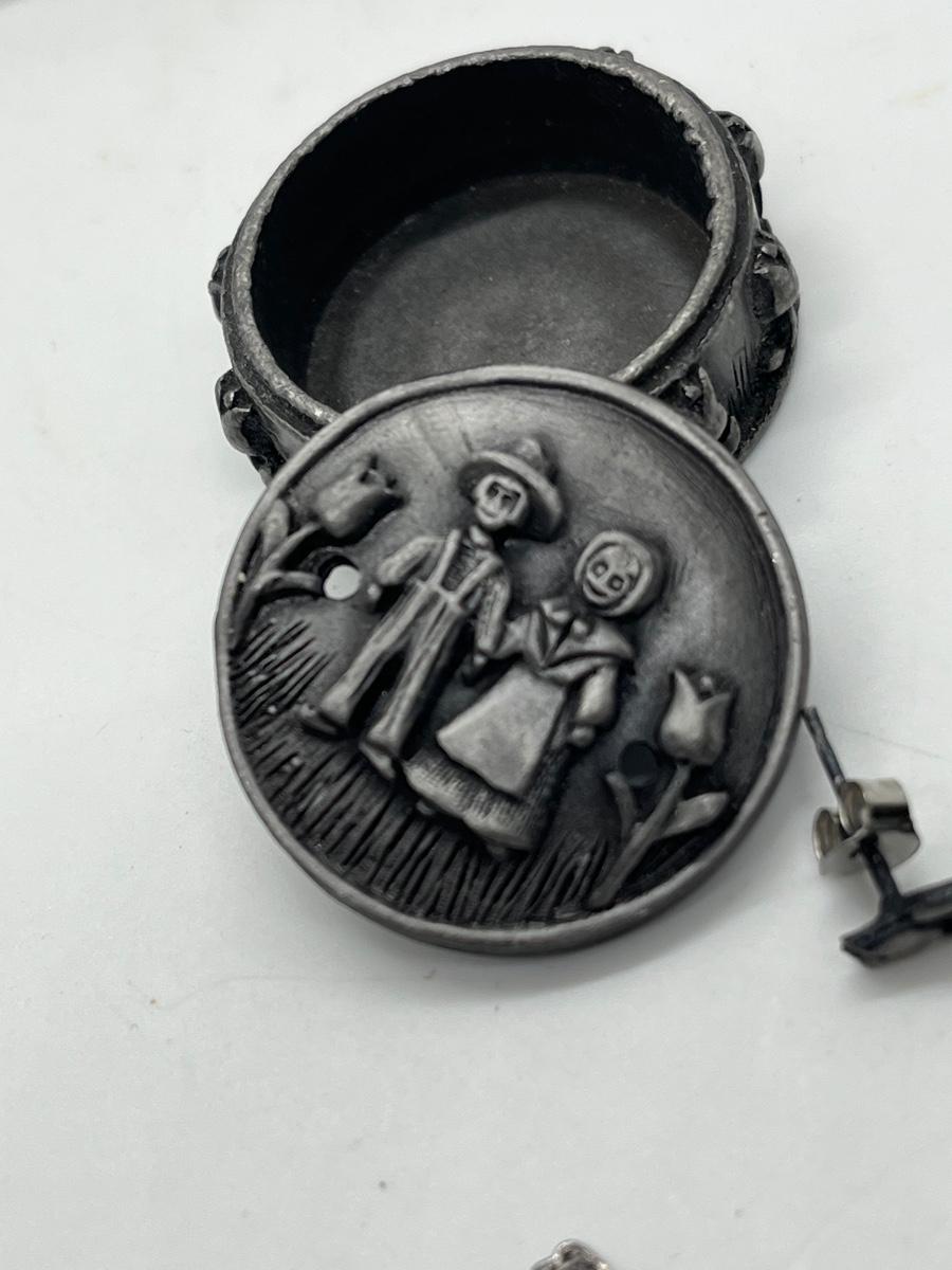 LOT 329J: Vintage Brooches / Pewter Trinket Box Jewelry Set