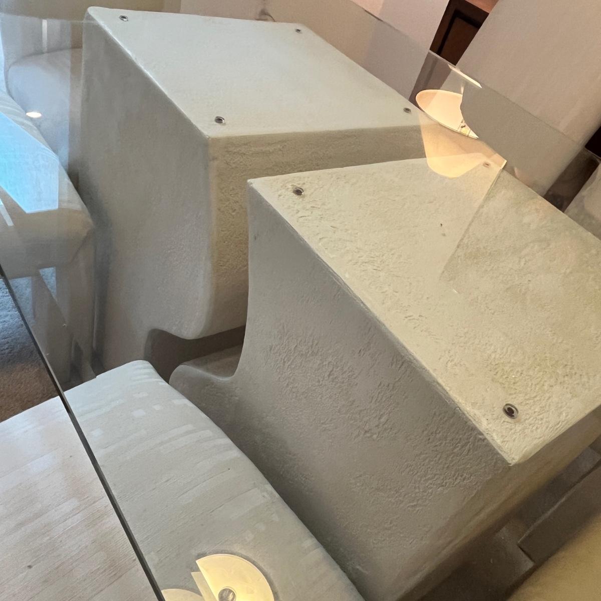 Stucco pillars, glass top w/ 6 padded chairs. Upholstery needs some attention.