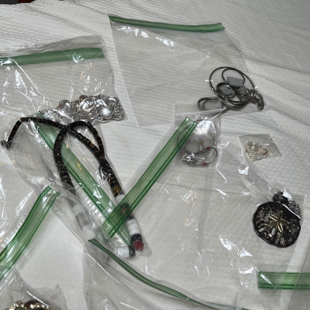 8. Sizes are approximate, you can estimate as our lot number signs are 3.5" long. Also we use an 18" & 36" measuring stick.  We try on certain things to do actual measurements. No guarantees on actual sizes, we try our best!