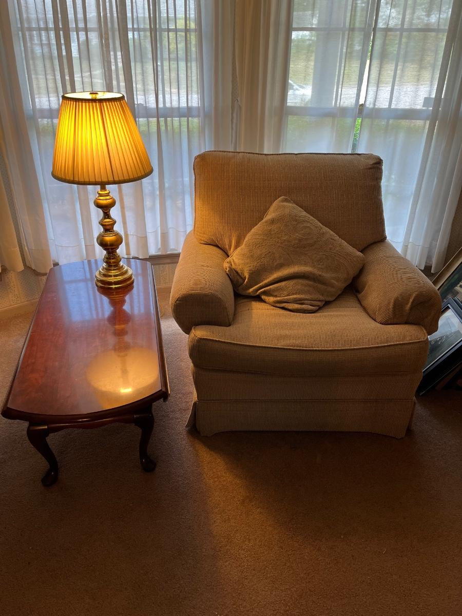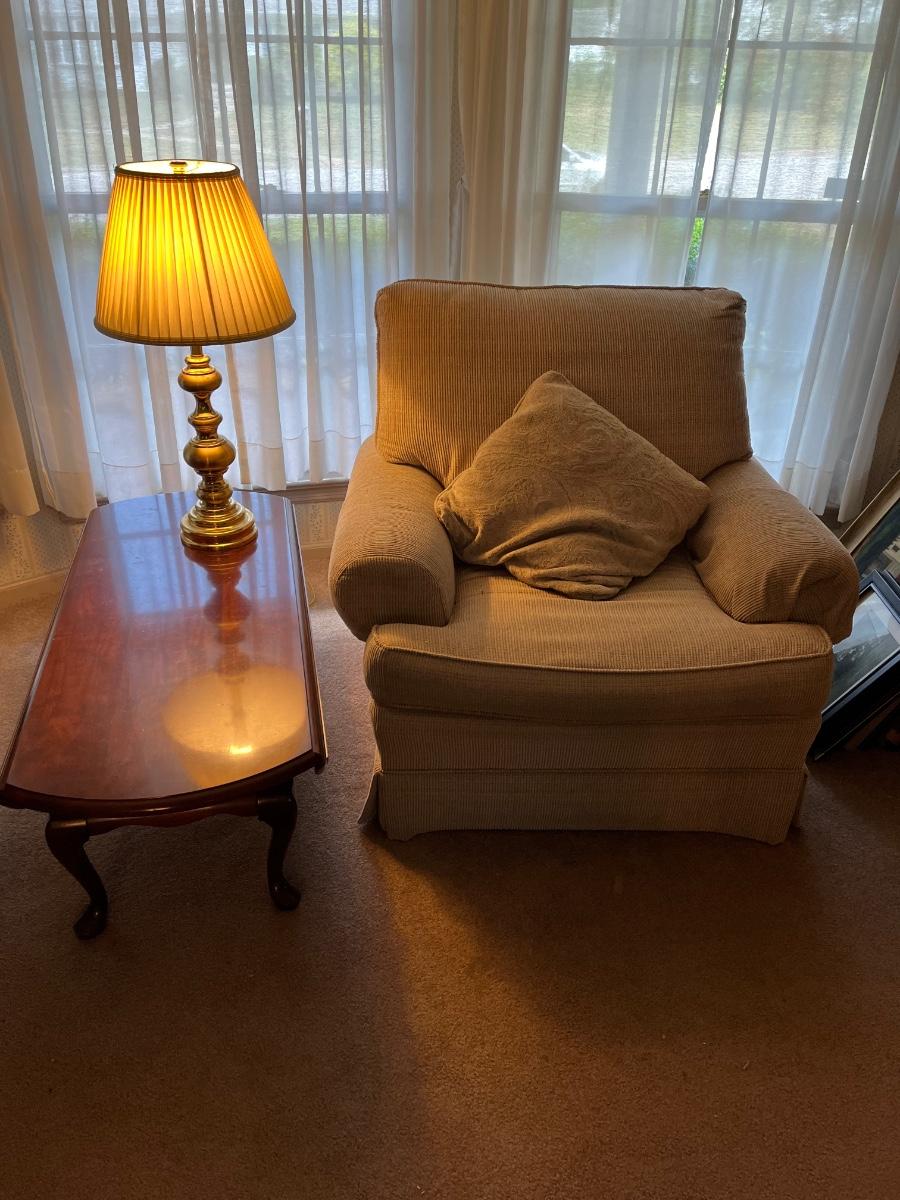 LOT 388L: Upholstered Armchair Coffee Table and Lamp