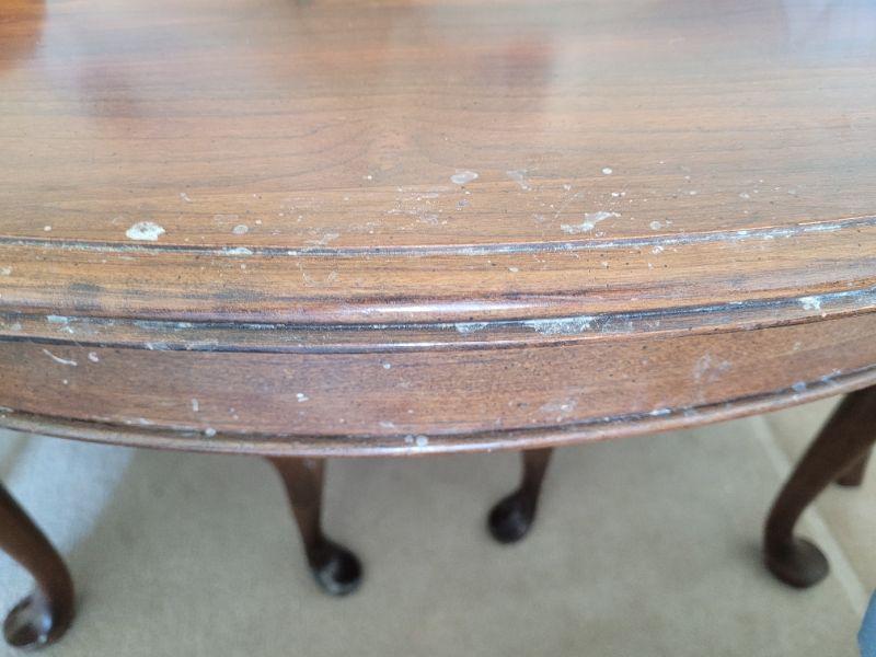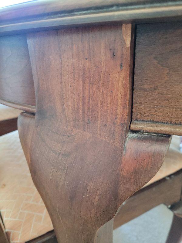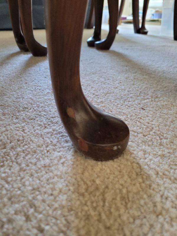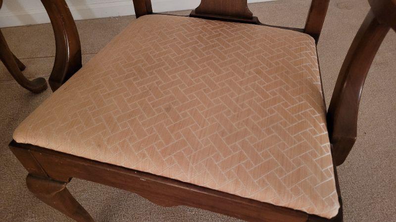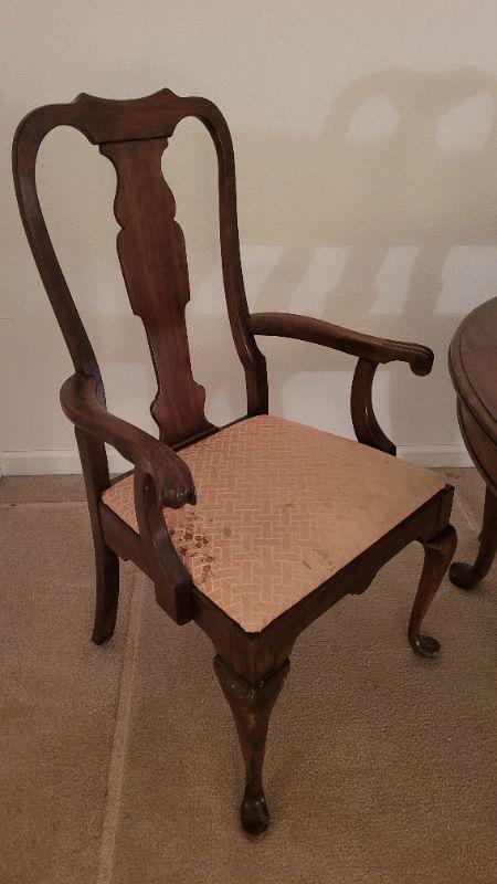 Chair Cushions have stains but can be recovered. Table and chairs have some nicks in wood and scuffs.