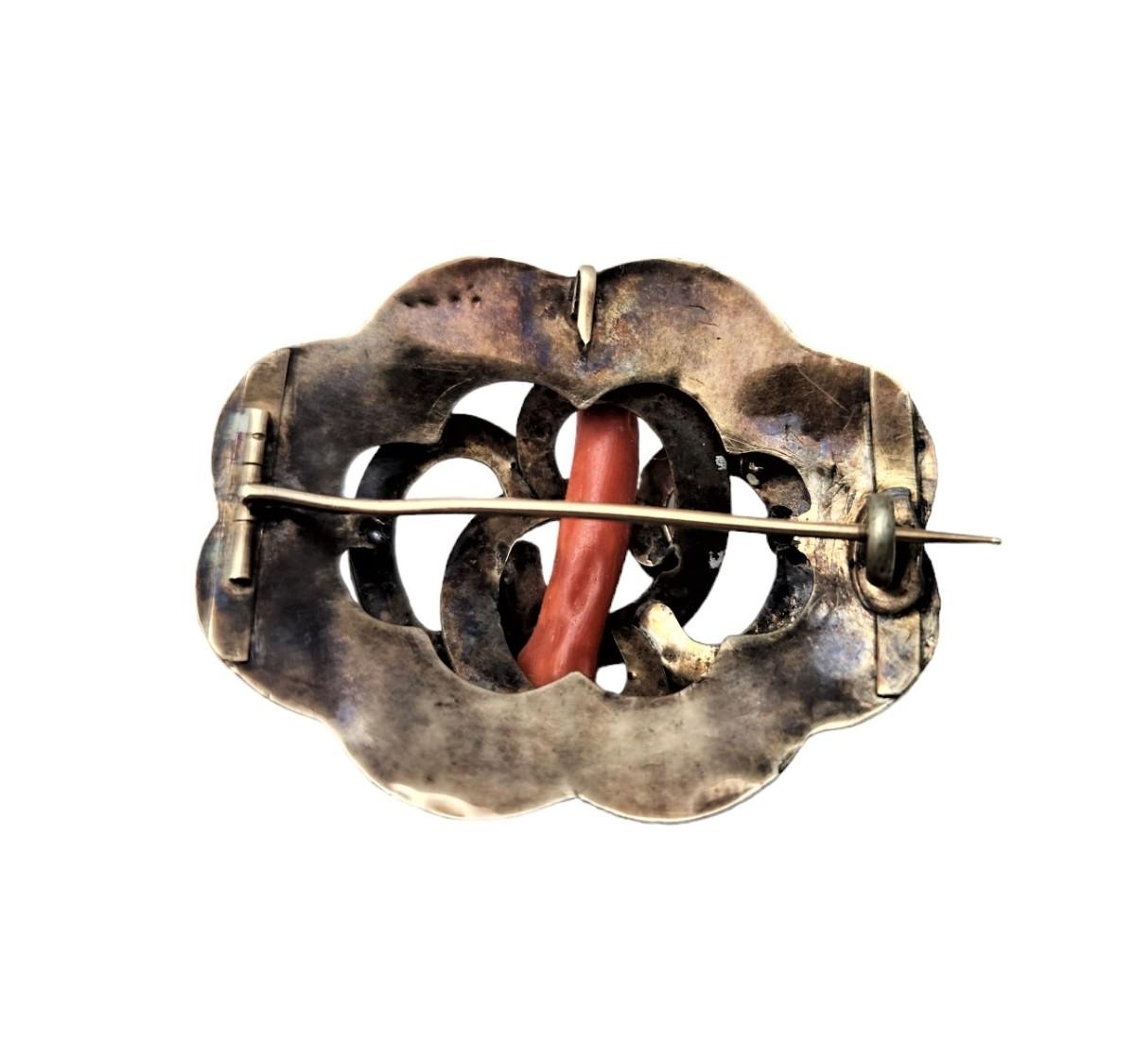 We had this piece tested by our jeweler and it is 10kt gold. Ca. 1870, old style "c" clasp. Note the Red Coral incorporated into the design. It is illegal to harvest this now. Coral was believed to bestow good luck on the wearer and keep away the "Evil Eye." Weighs about 5.7 grams. Opening bid is a little able scrap price.