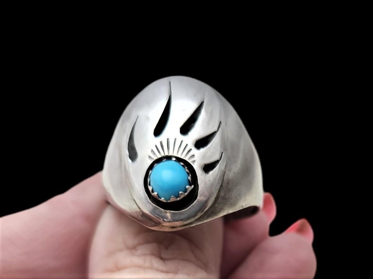 Artisan ring - Southwest Style - marked Sterling. Features a sky blue turquoise bit. Size 14.5, bordering on a 15. Weighs about 13.6 grams. Measures 1 inch tall. It's a beauty.
