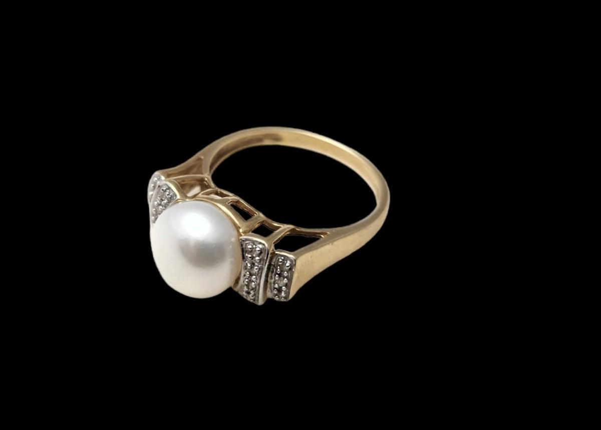Contemporary 14kt (marked and tested) gold ring with a lustrous pearl and twinkly diamond chips as accents. Good condition, size 8. A beauty! Opening bid is just a little above scrap value.