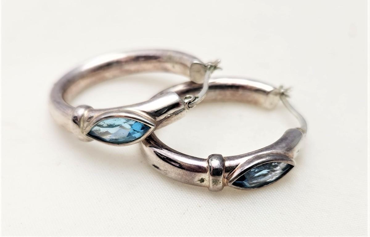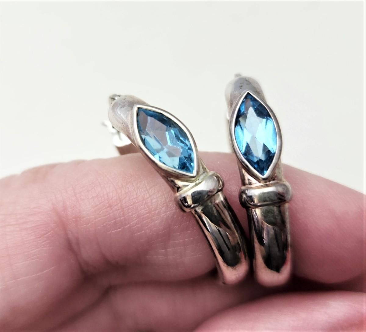 These are really pretty - sterling silver (marked) - each sporting a faceted oval blue topaz. Each just a little under 1 inch long. Approx 6.9 grams. Estate piece - gently used condition.