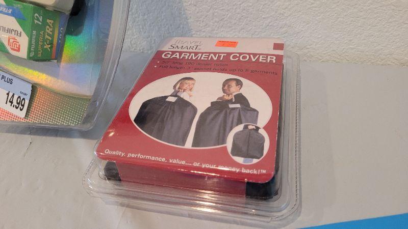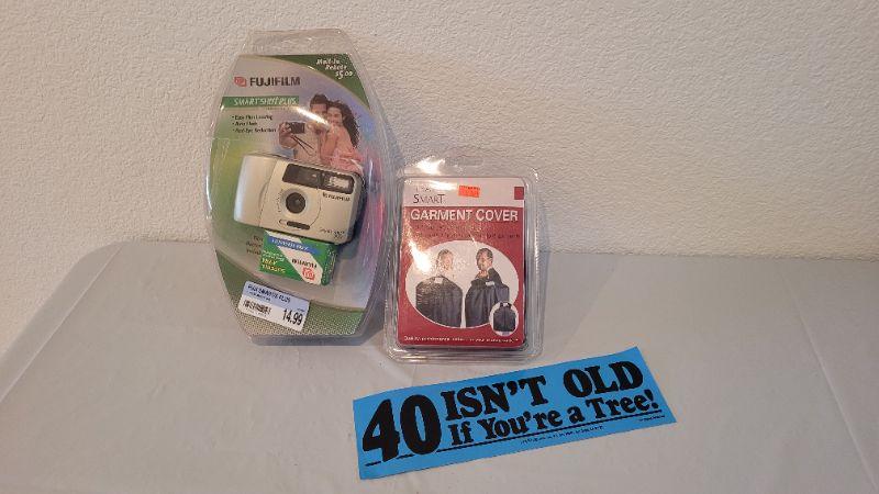 Lot 8: Assorted NEW Finds: Camera, Bumper Sticker and Garment Bag