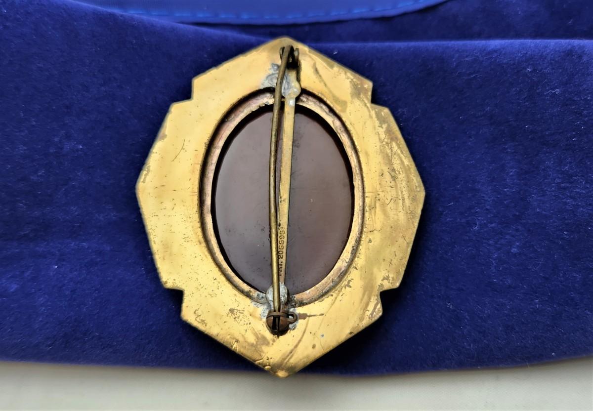 This cameo is over 100 years old - probably gold filled mount, has a patent number of 206696 under the old-style pin. I believe this is American-made, not English. Still, the mount/surround is very pretty and the photo doesn't do it justice. Measures about 2 inches tall - good antique condition.