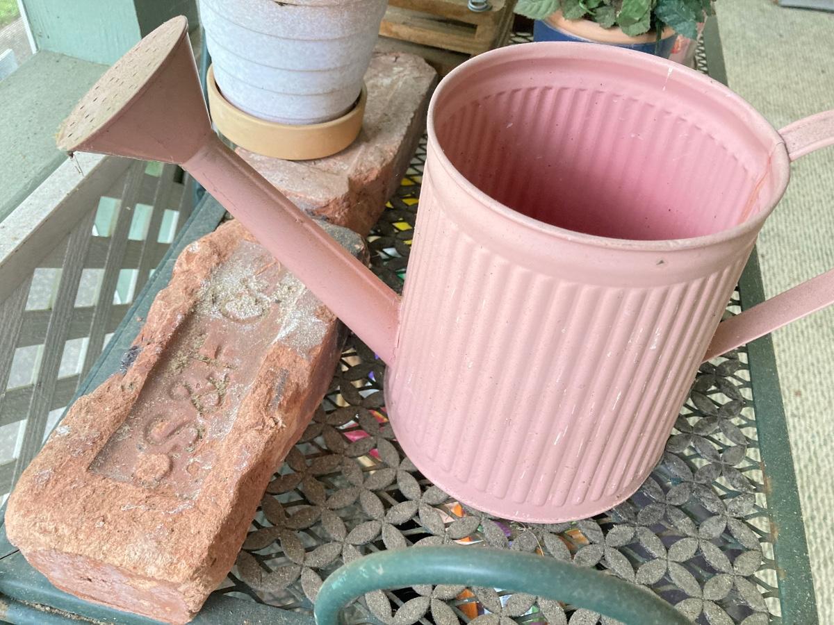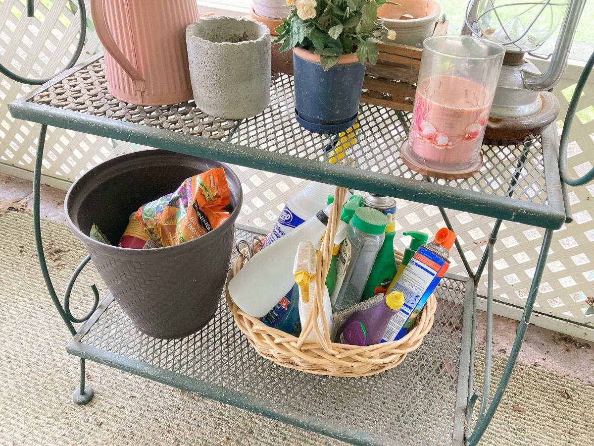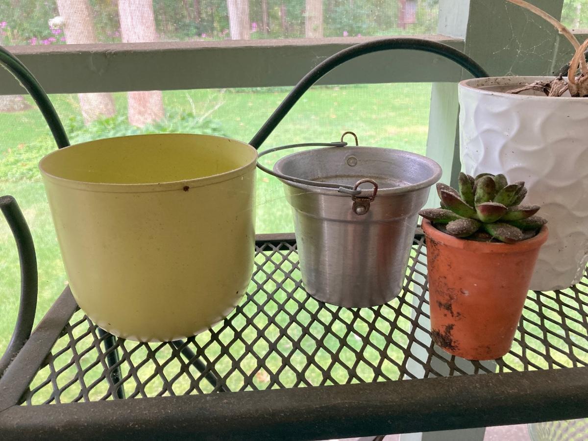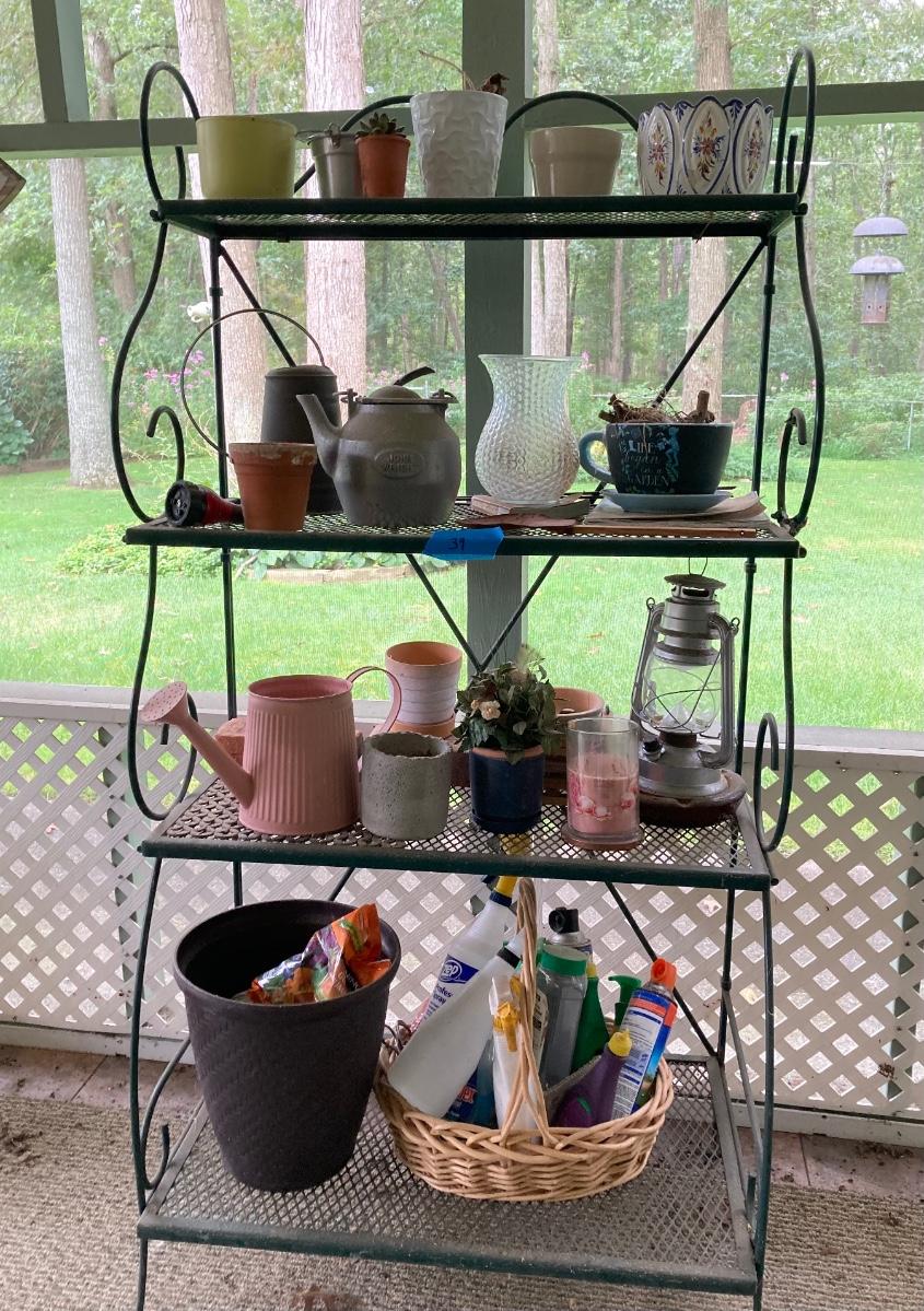 LOT 39P: Green Metal Garden / Storage Rack with Decorative Planters and More