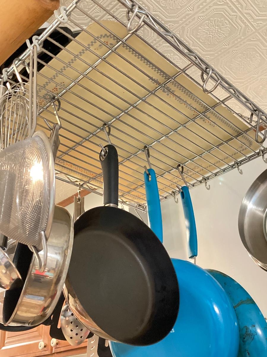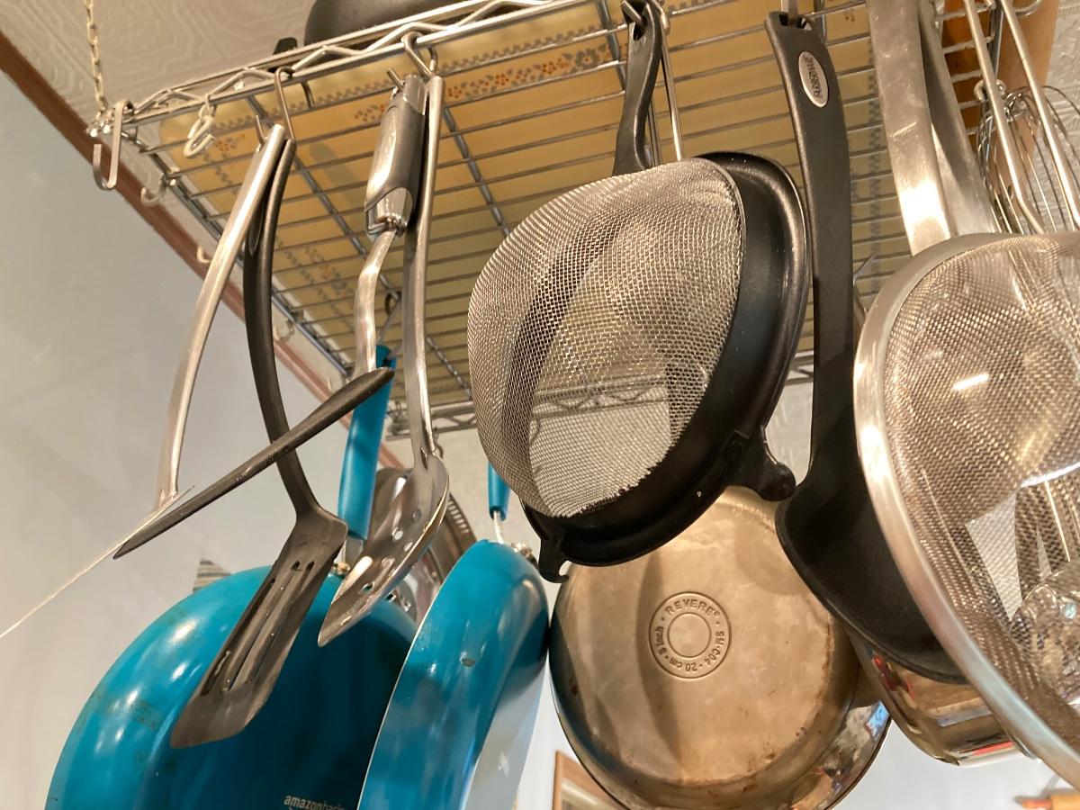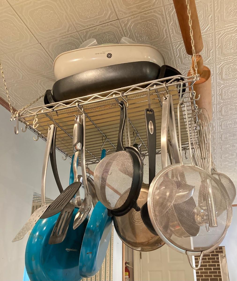 LOT 66K: Hanging Kitchen Rack with Pots, Pans and More