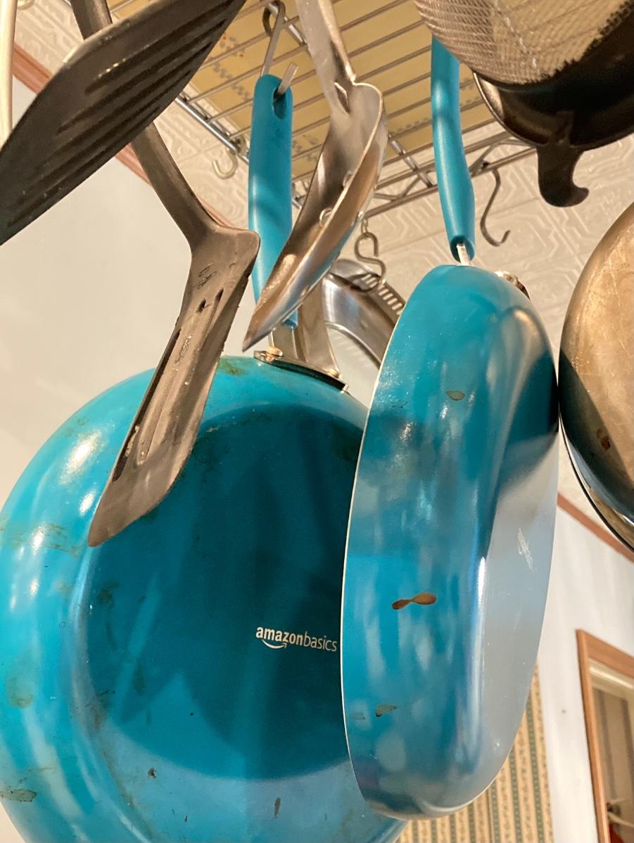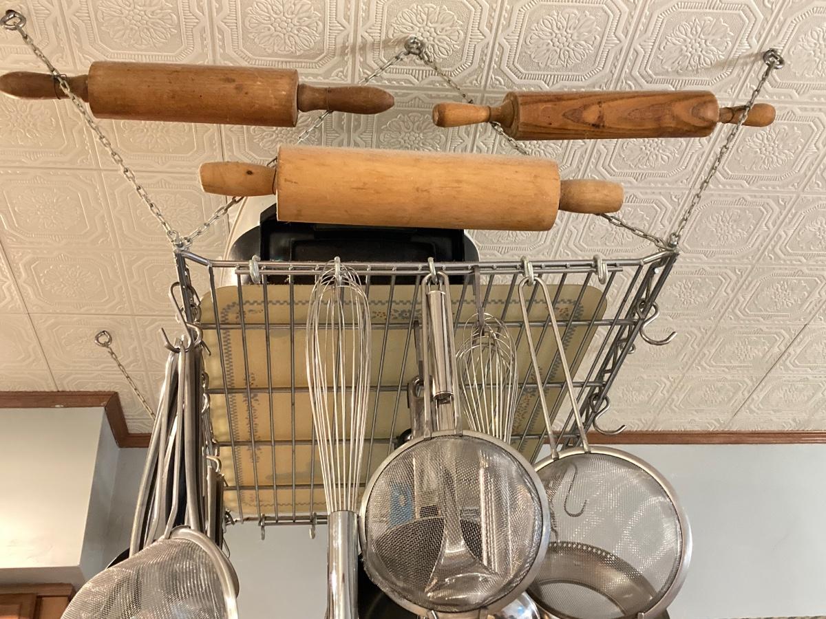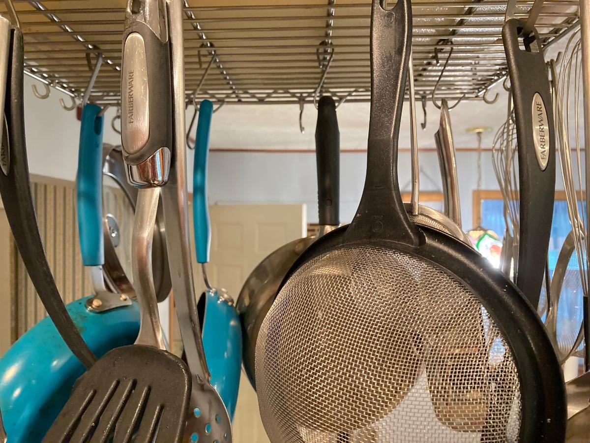 LOT 66K: Hanging Kitchen Rack with Pots, Pans and More
