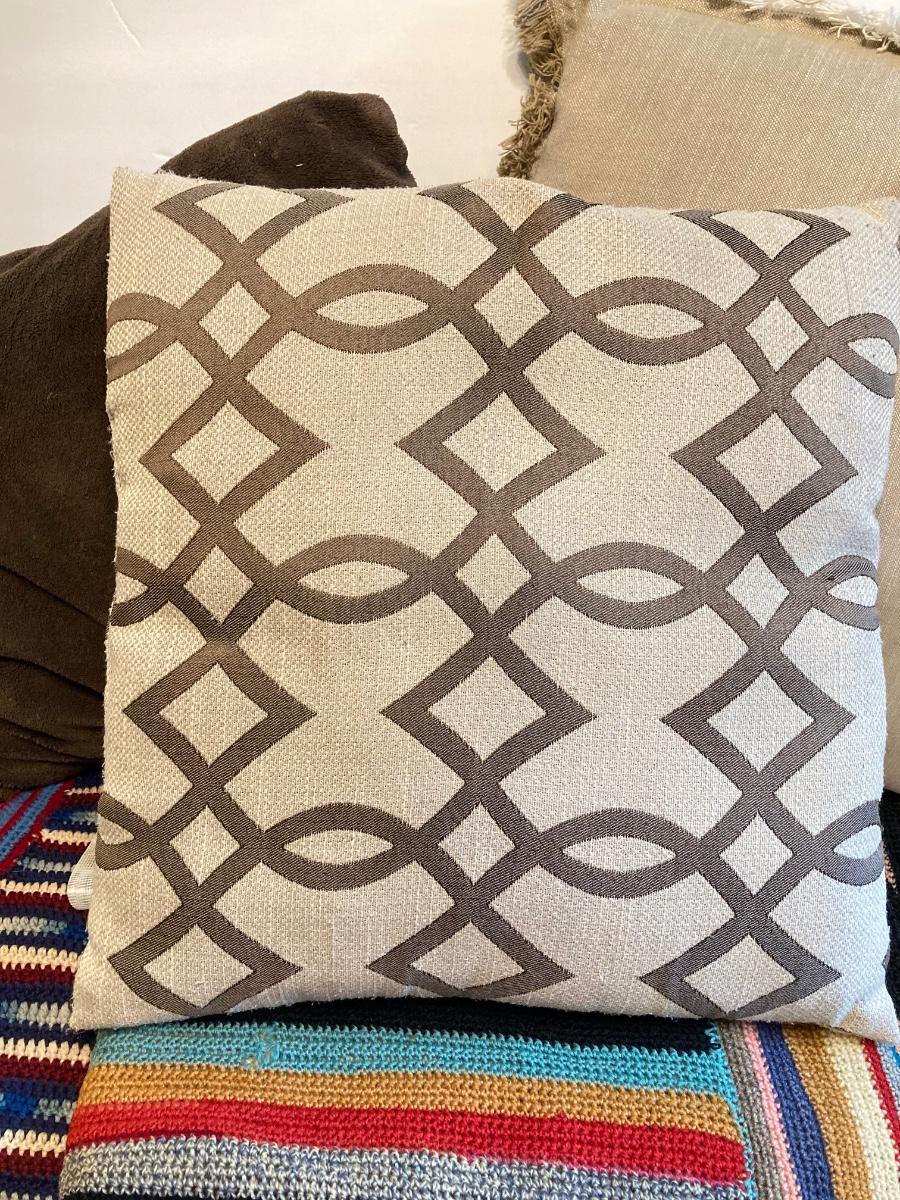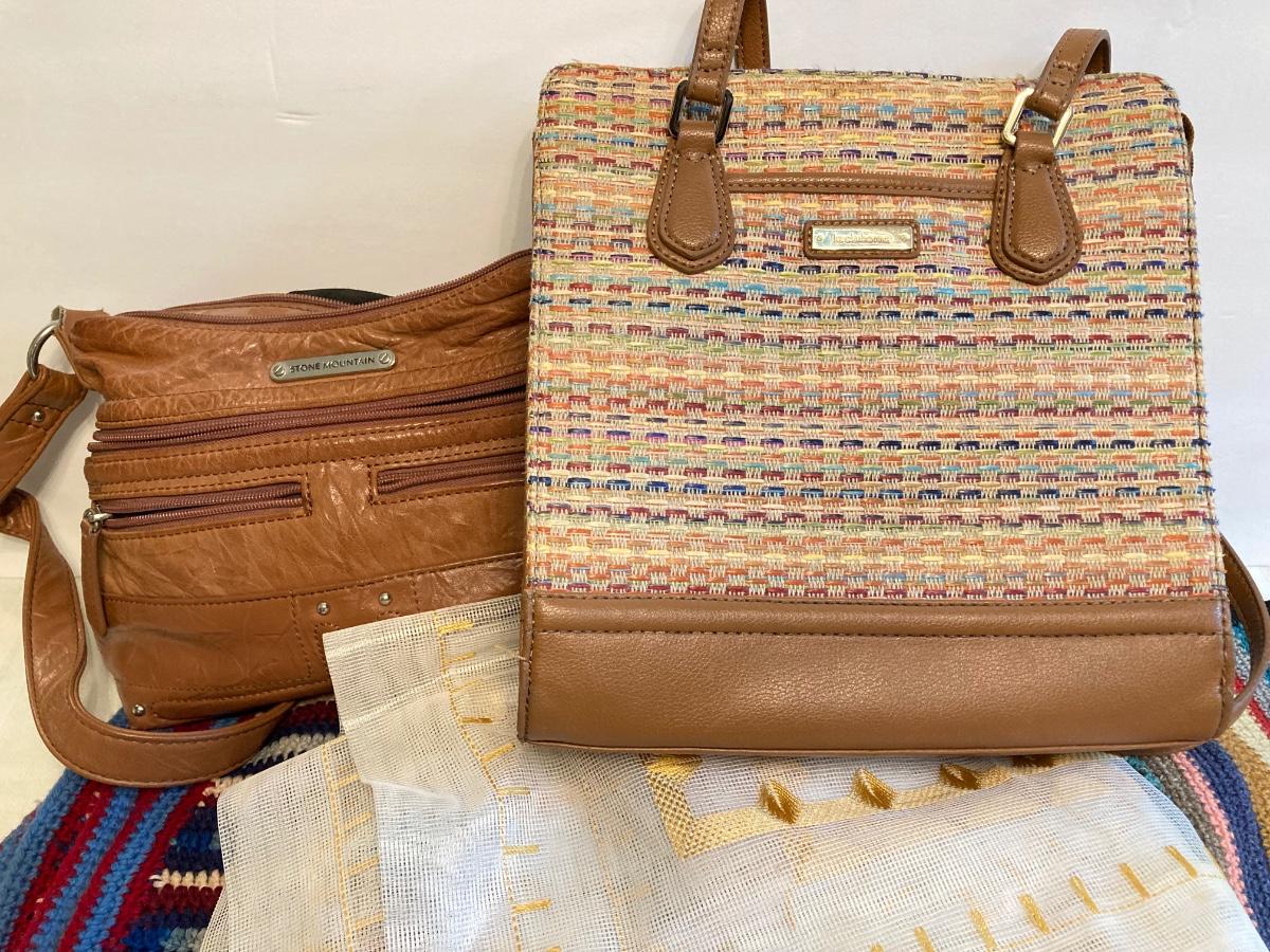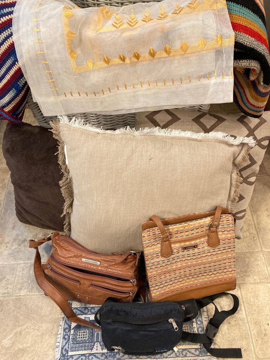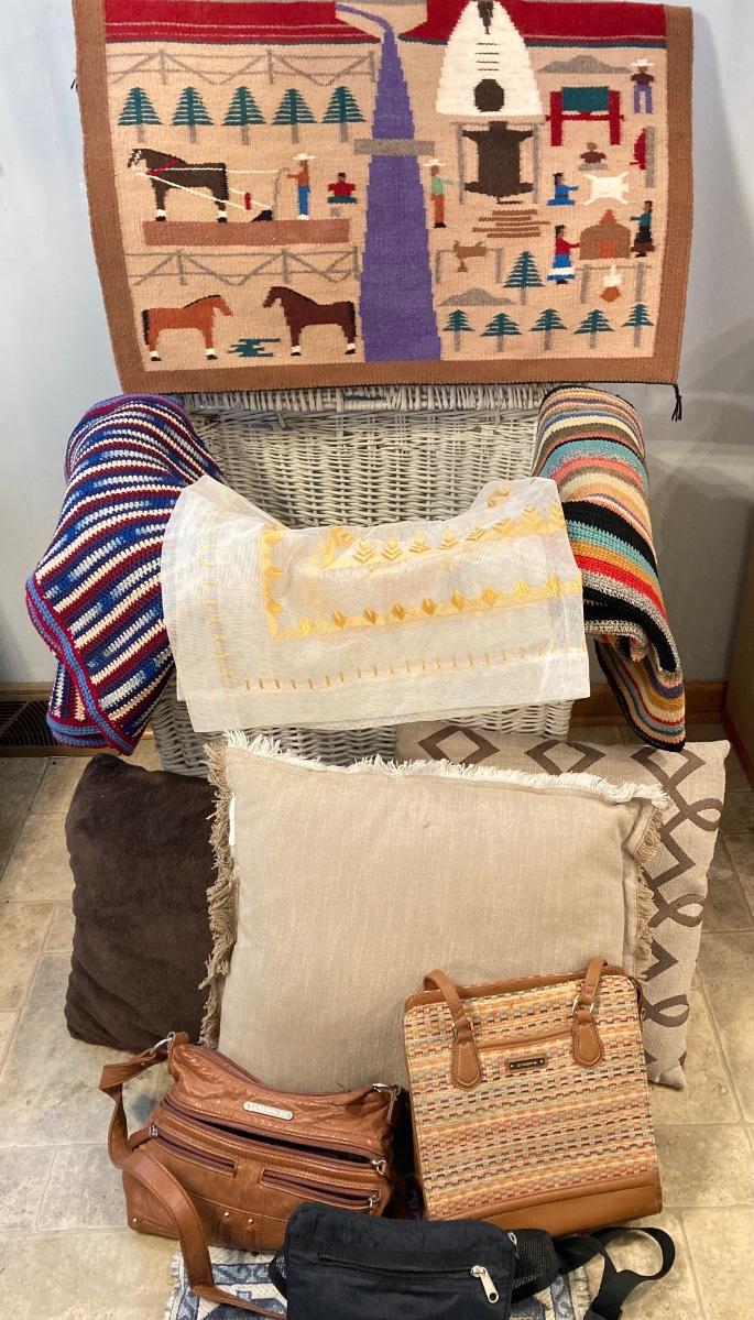 LOT 79K: Large Wicker Basket filled with Pillows, Wall Tapestry, Handbags, Throws and More