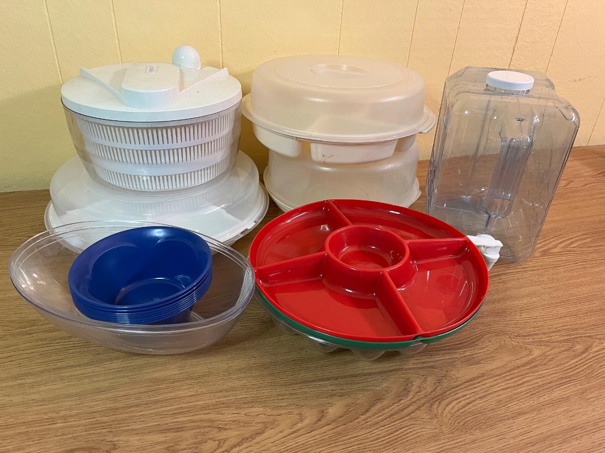 LOT 214B: Assorted Plastic Kitchen Essentials - Salad Spinner, Serving Platters and More