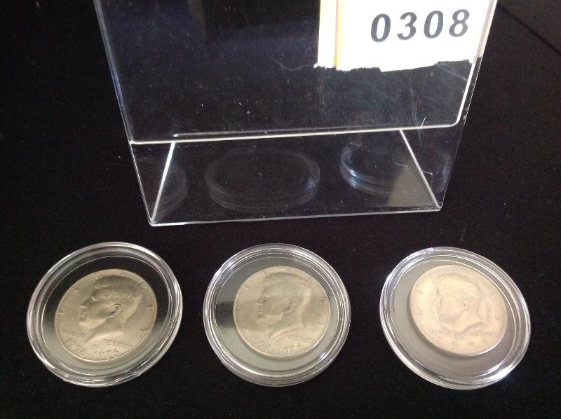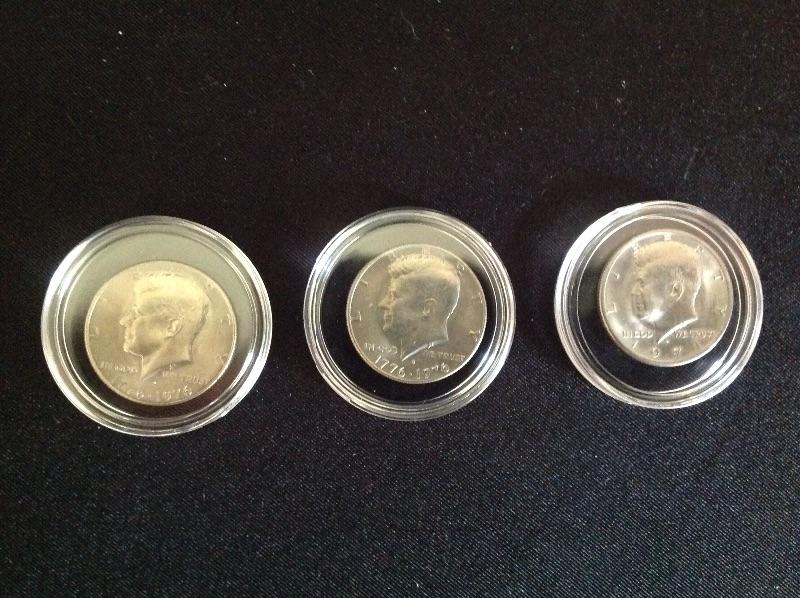 Lot of 3 Kennedy Half Dollars. 1976, 1976, 1971. Circulated