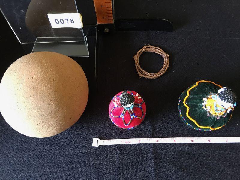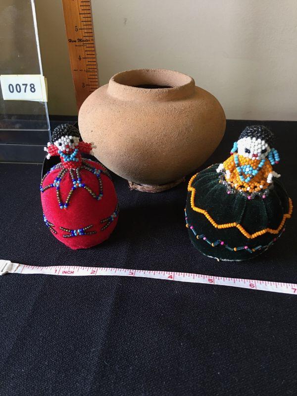 lot of Beaded Native American pincushions and a small Mexican pot. Vintage. Cute!
