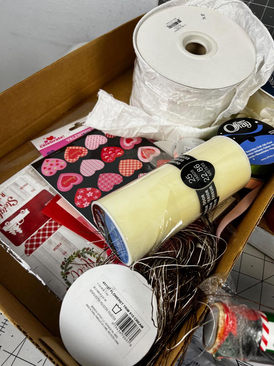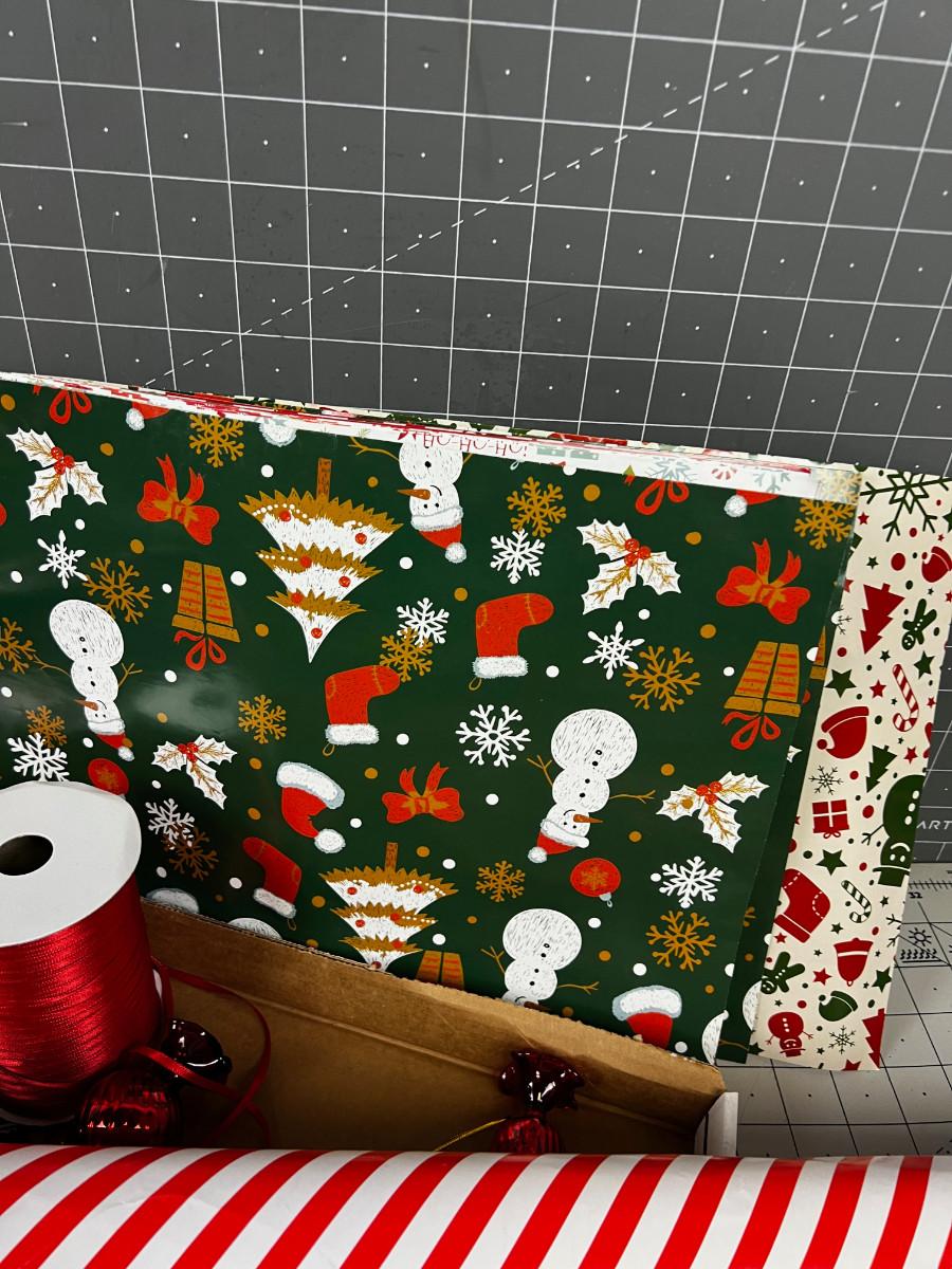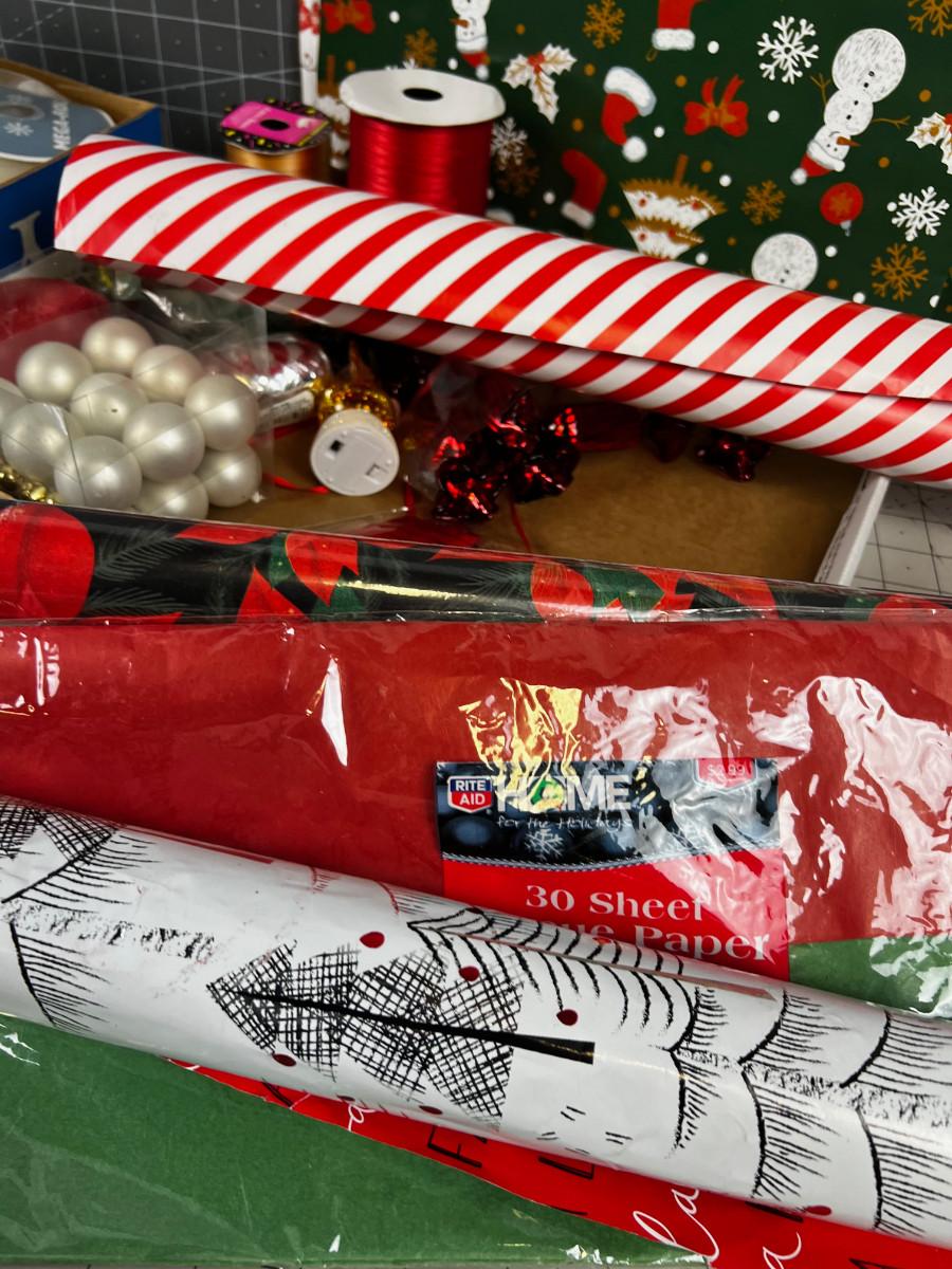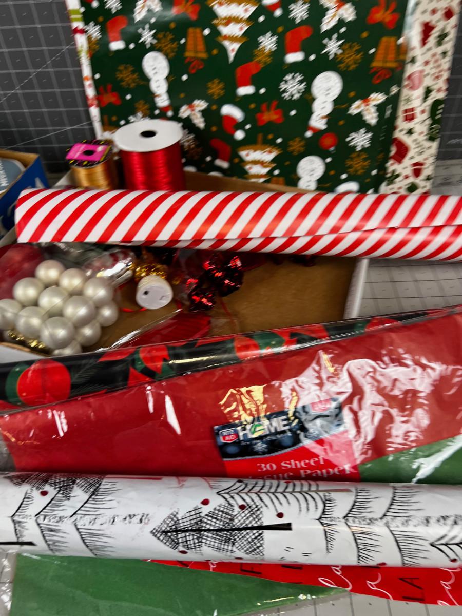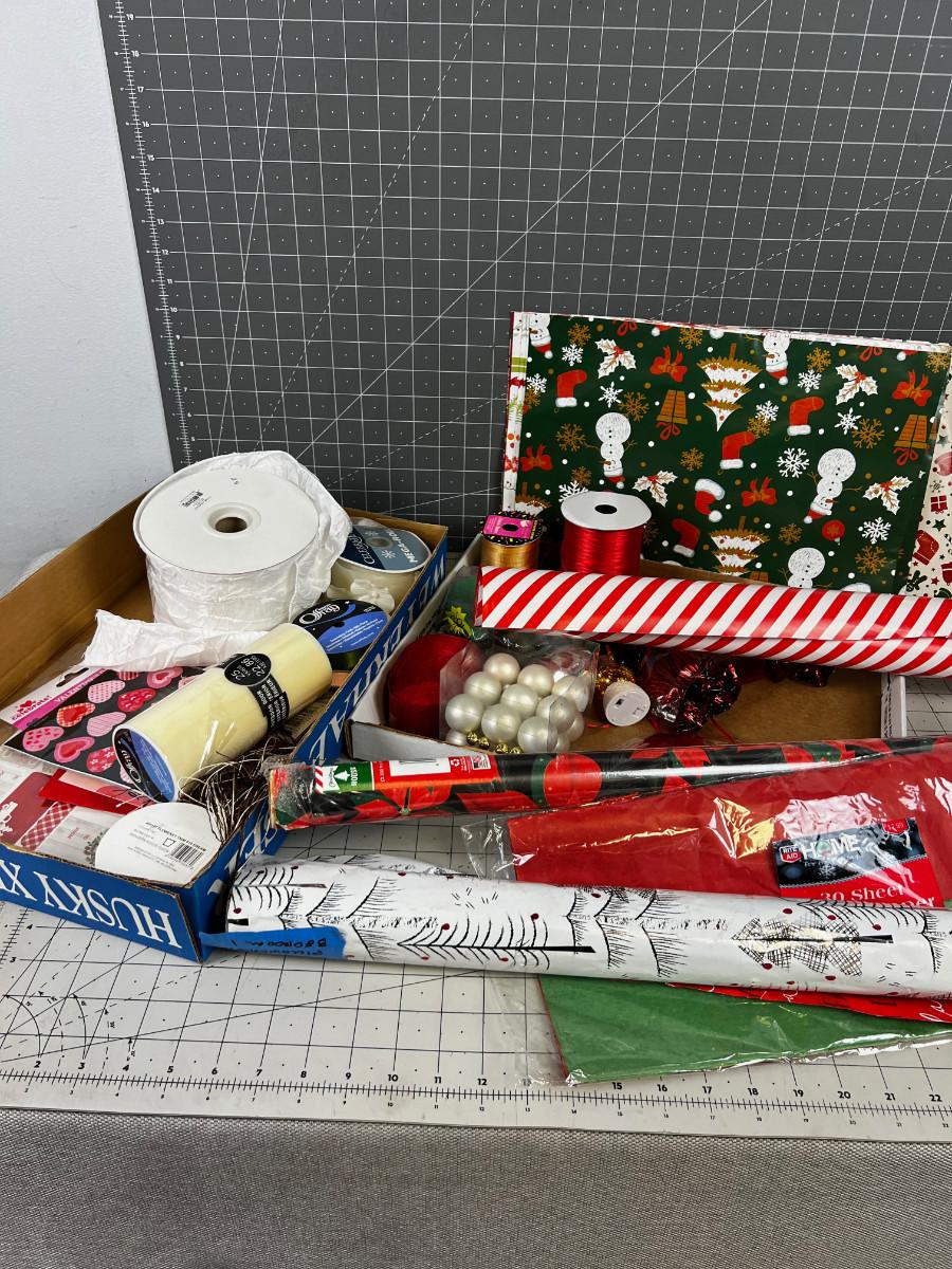Lot of Christmas Wrapping Paper, Ornaments and Ribbon