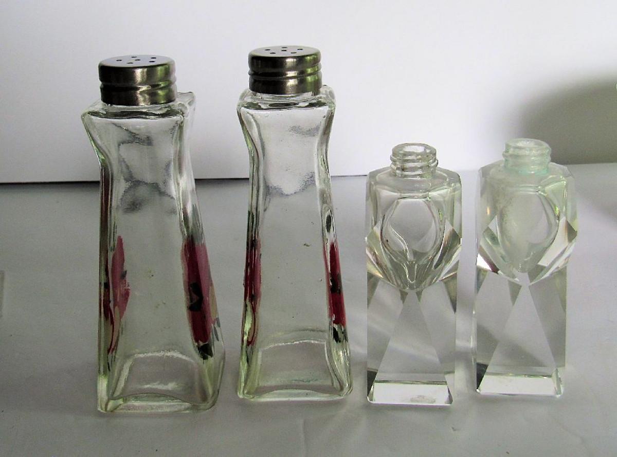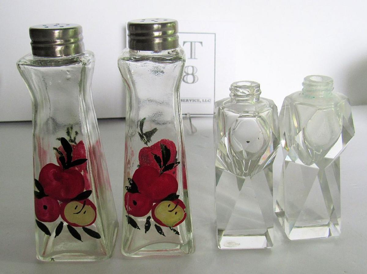 Some cloudiness on the two fancy ones, but don't have a tiny brush to try to clean. Small ones need deep cleaning. Wear on the salt dip. Shipping is available at shipping cost plus $5.00 handling fee on one box, $10.00 handling fee on two boxes, $15.00 handling fee on 3 boxes. Helps cover shipping materials and labor cost.