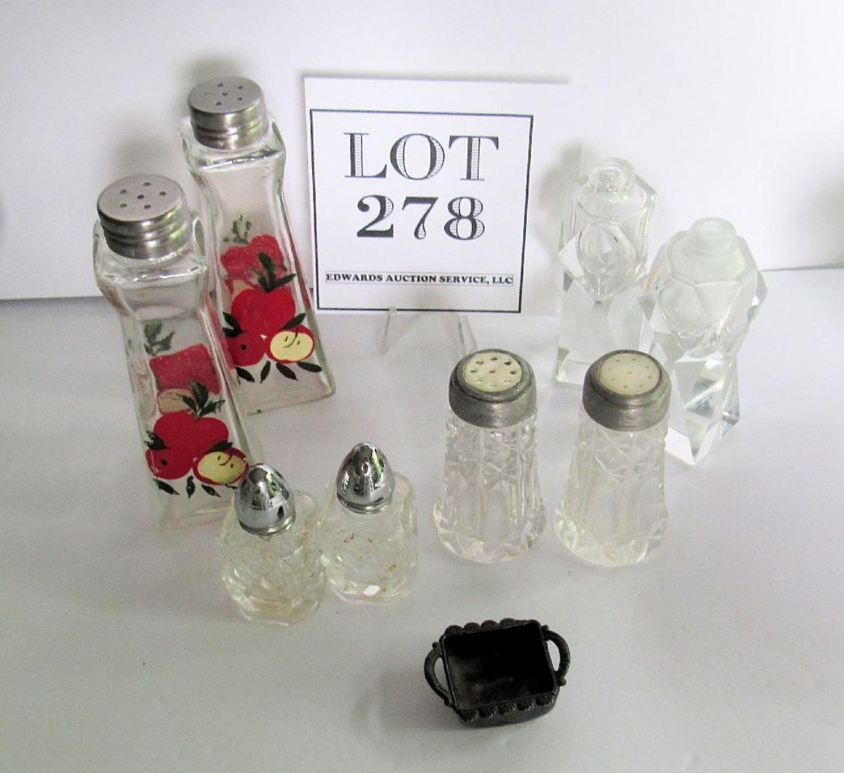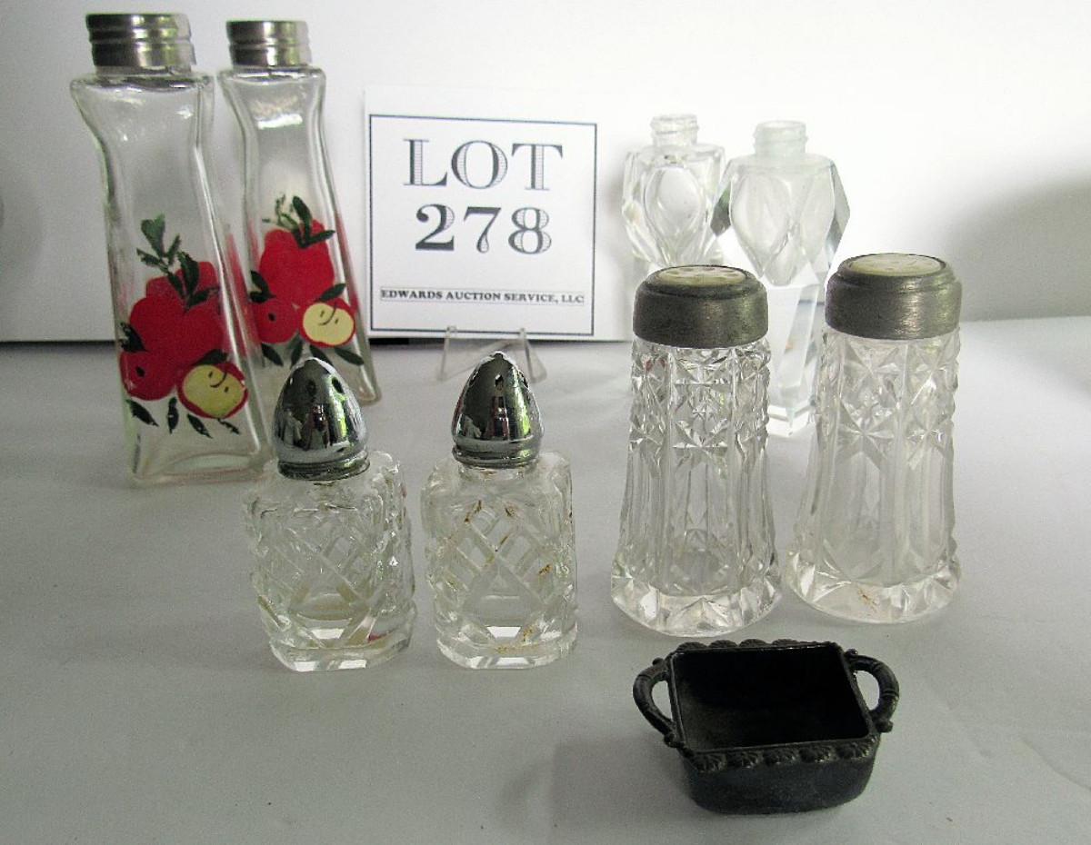 Lot of Clear Salt Shakers, One Hand Painted Set, and Metal Open Salt