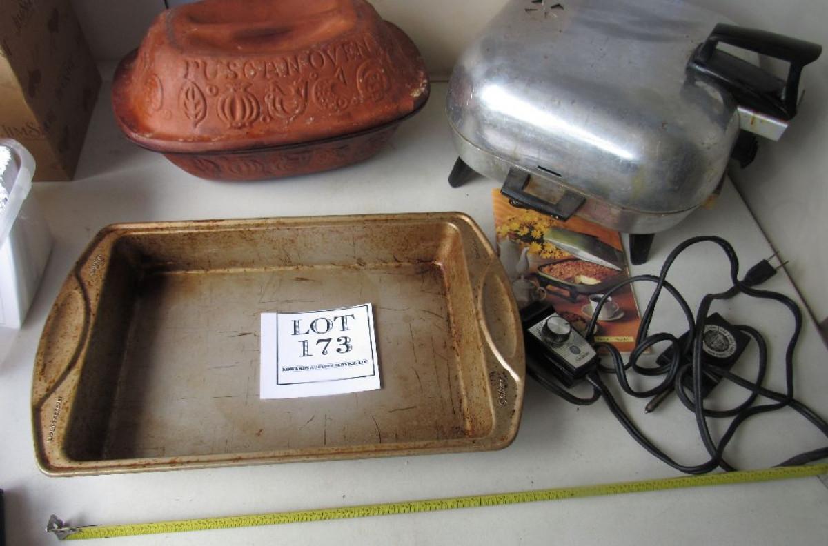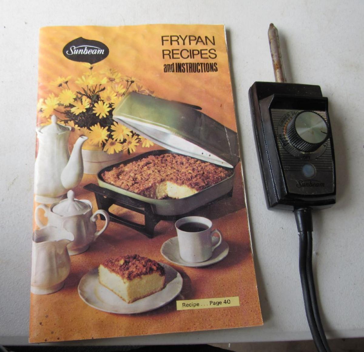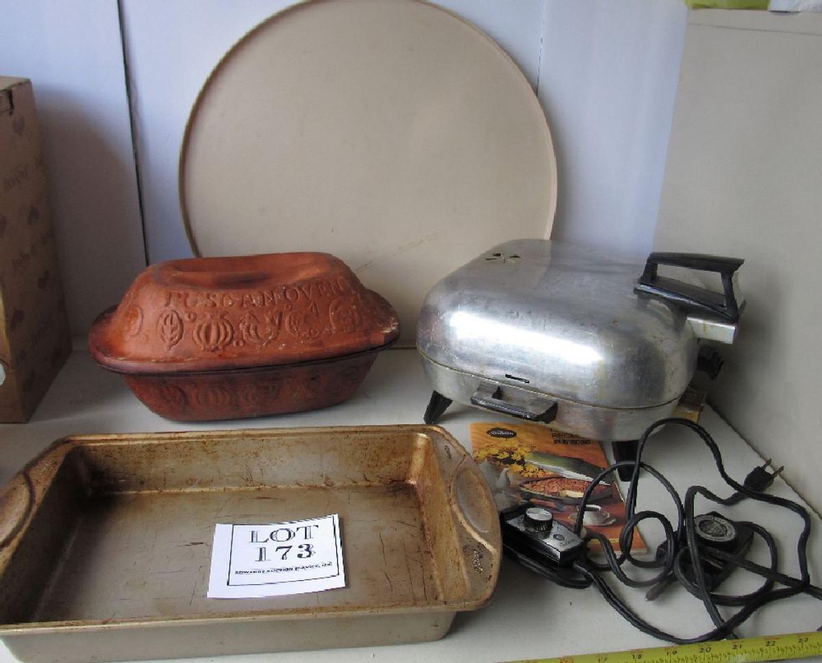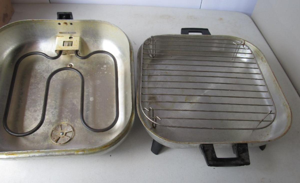 Fryer has cord, rack, booklet and extra cord. Needs a deep cleaning, didn't try to see if it works. Baker is chipped and dirty and needs a deep cleaning. Pan is well used.