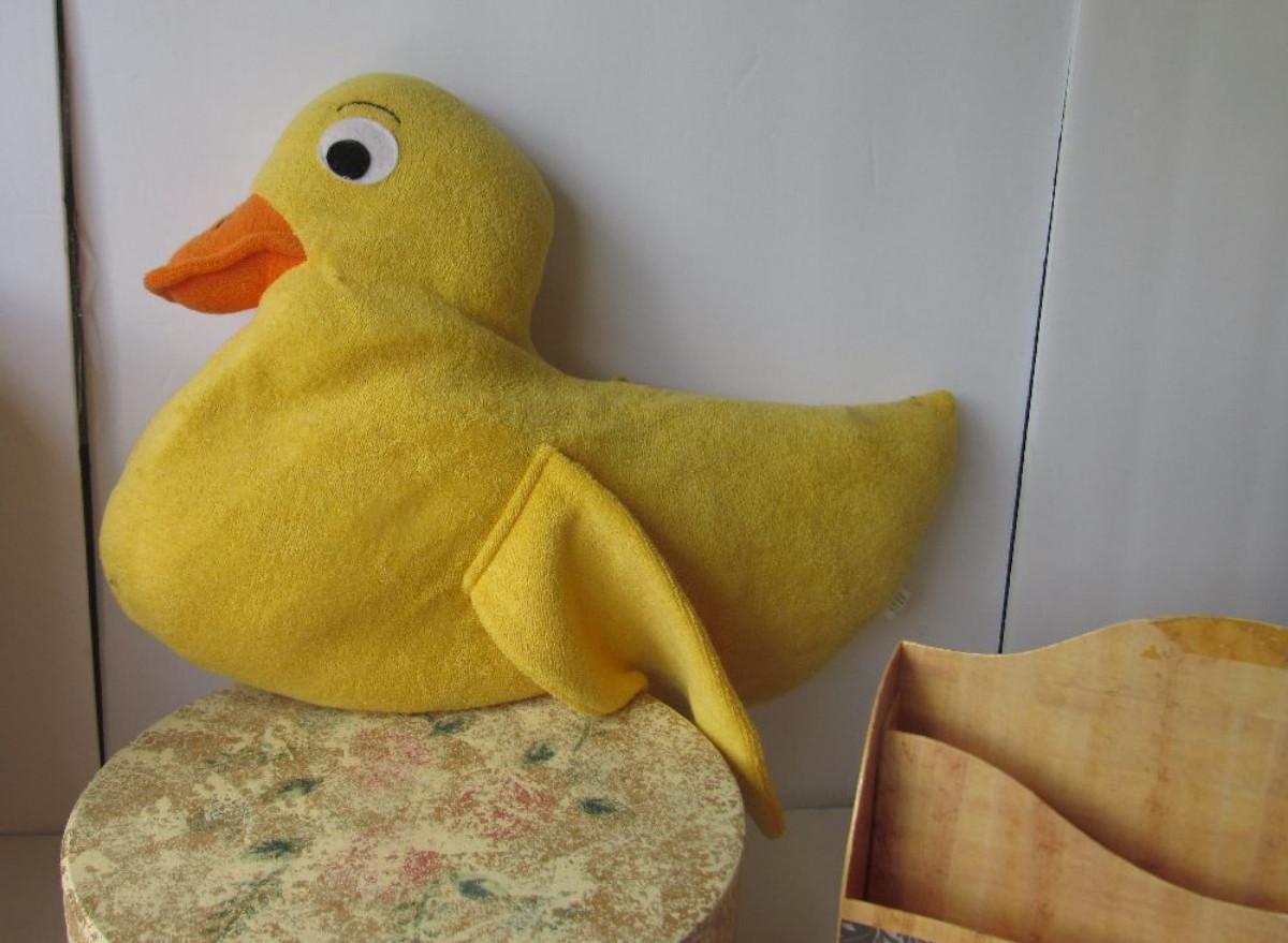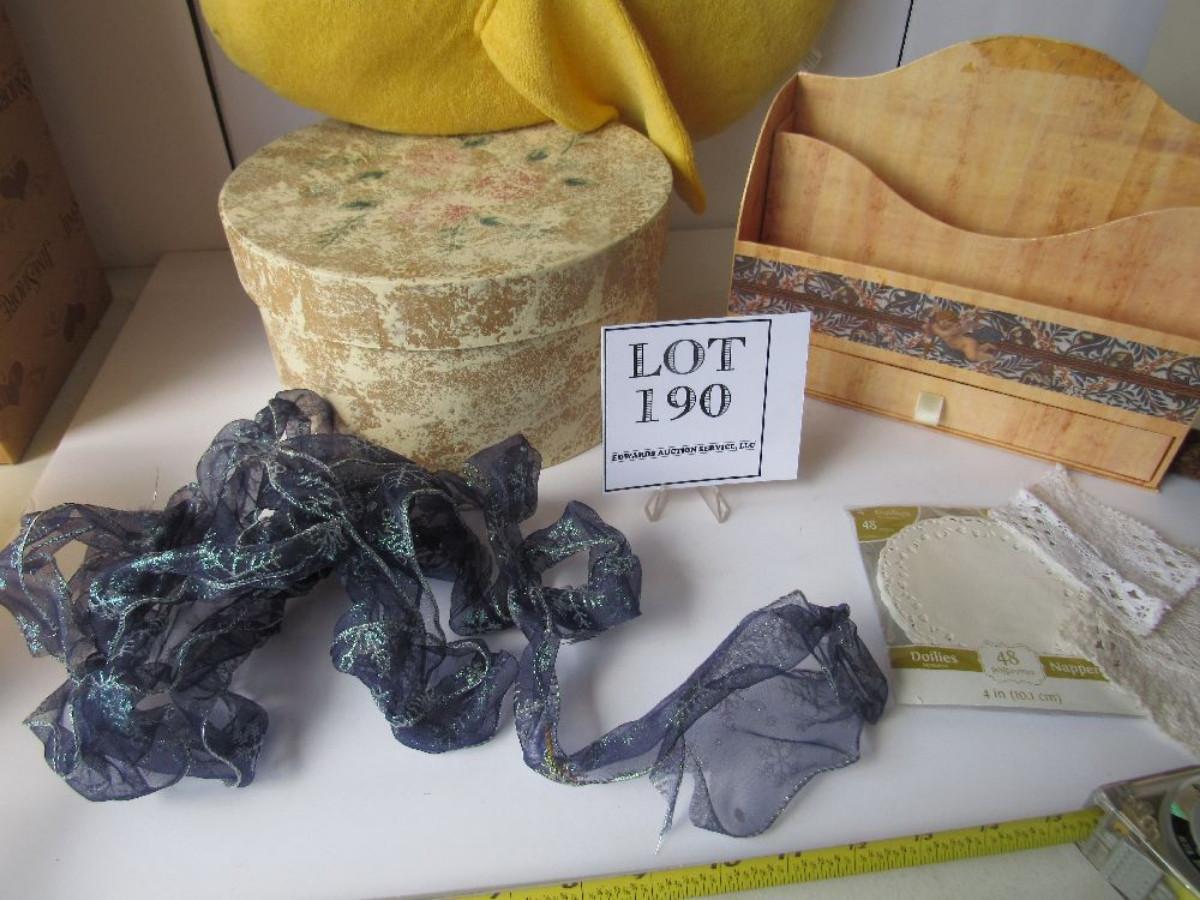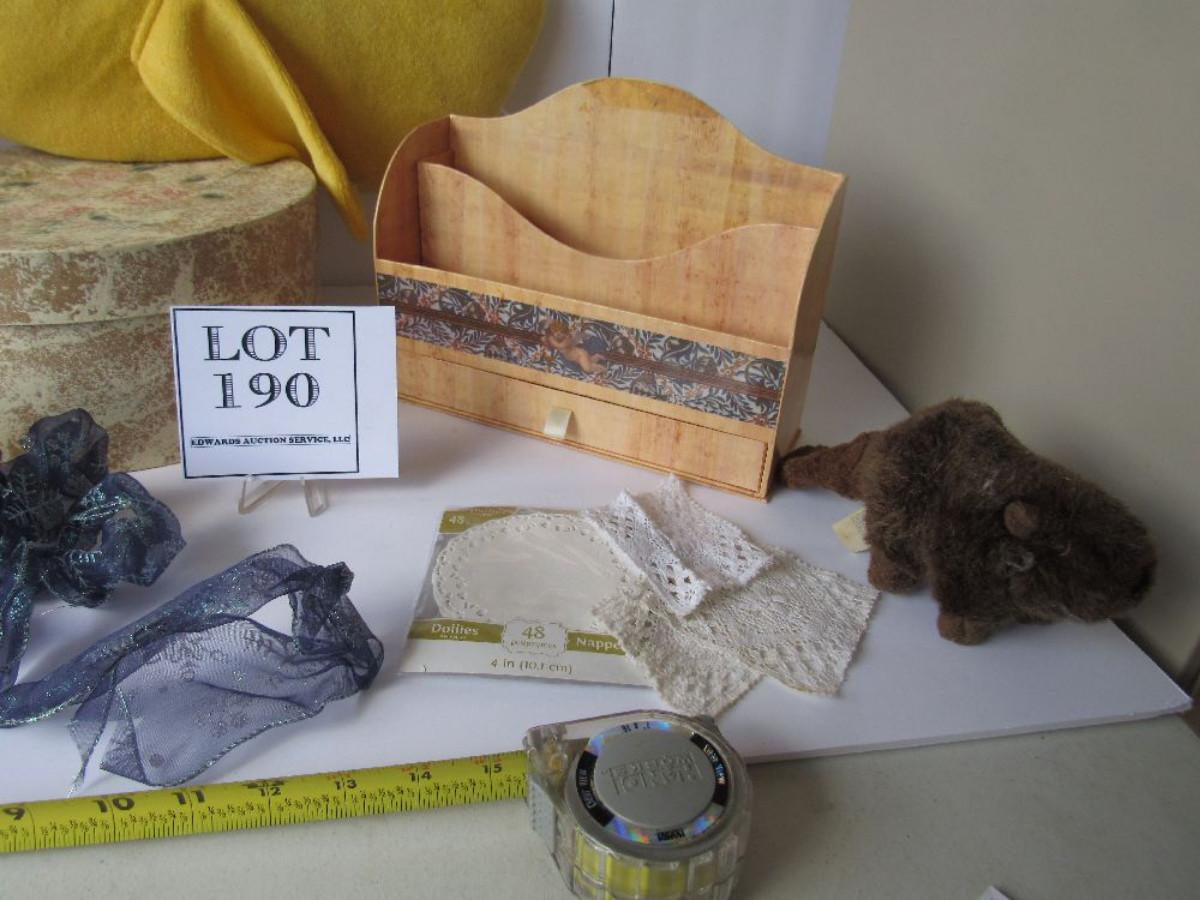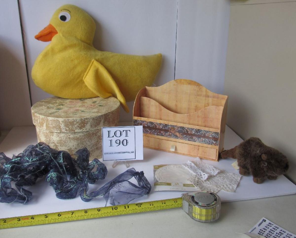 Decorative box, mail holder, decorative ribbon and paper lace doilies, plush duck and other animal.