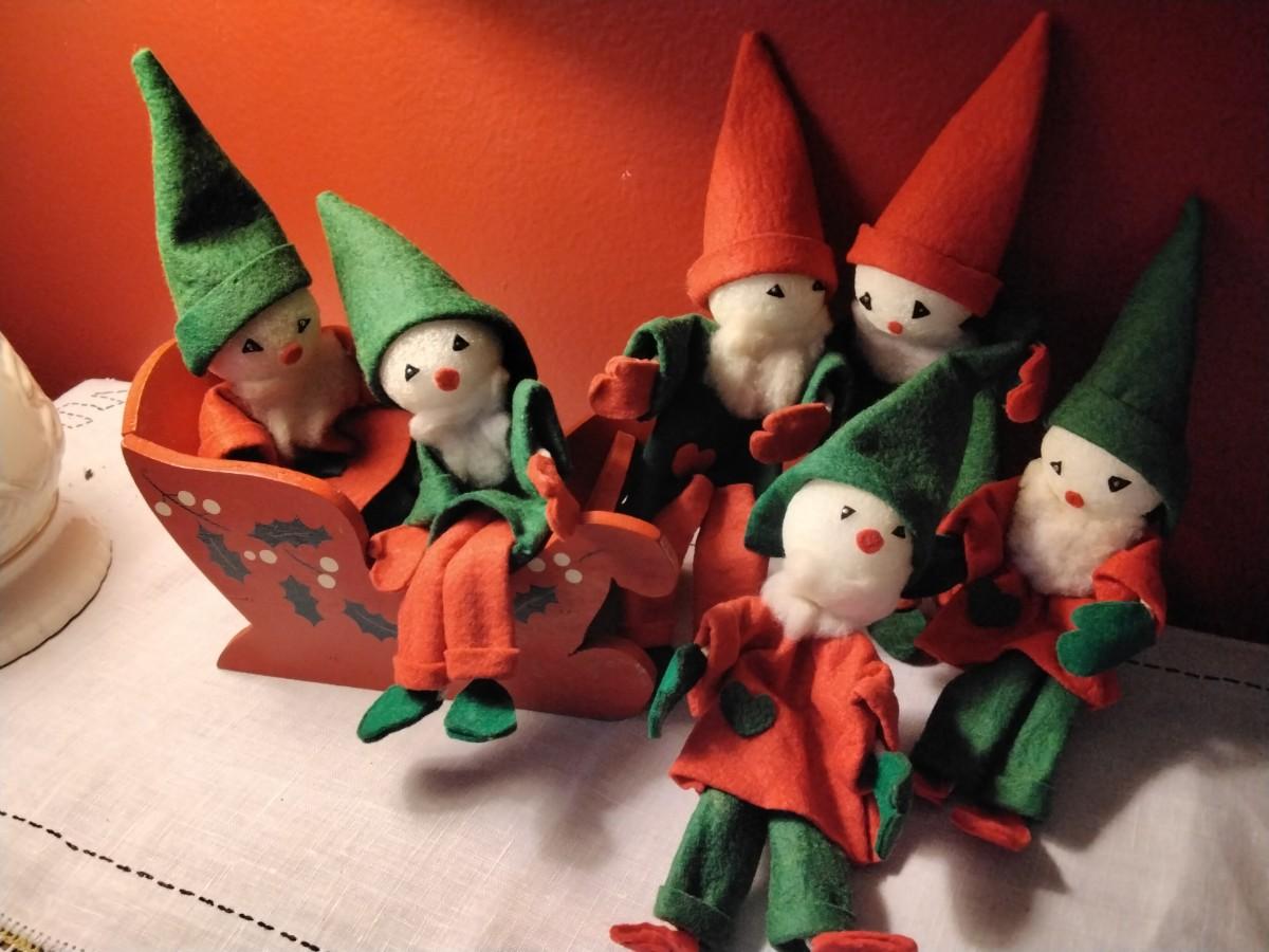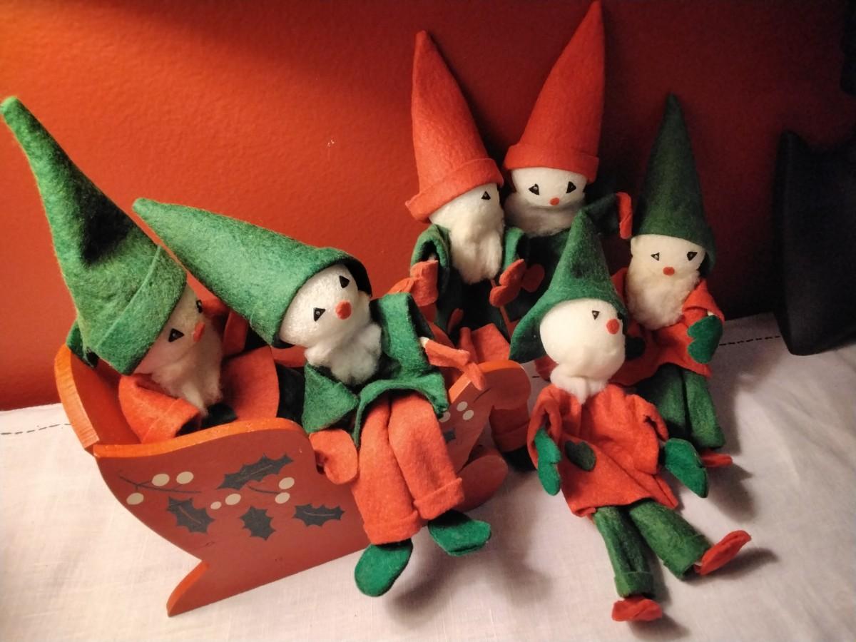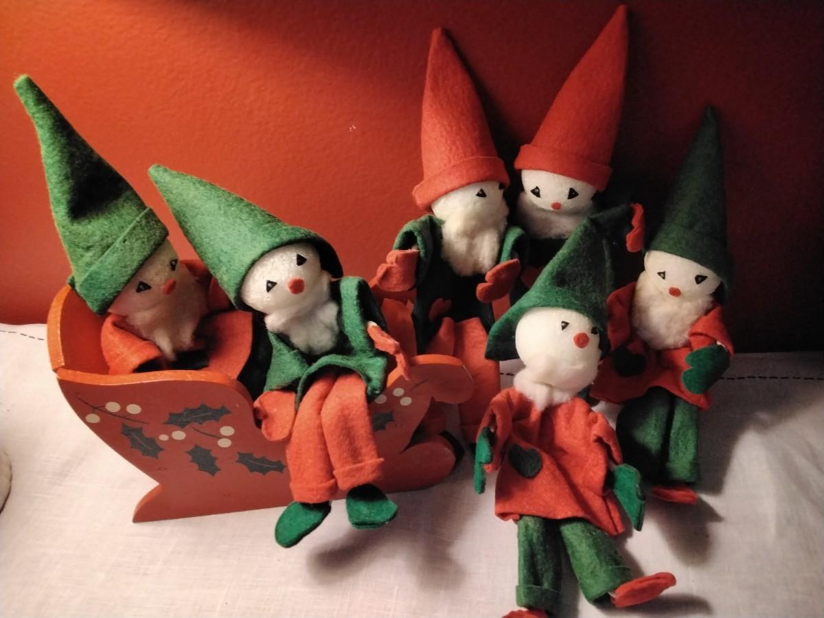 Lot of VERY Vintage Elves With Wooden Sled